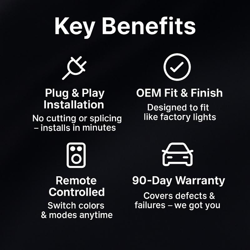 Control the lights remotely with 16 color options. Switch between static, flash, fade, strobe, and smooth modes. Adjust brightness with 15 levels to match your style. Direct clip-in OEM fitment ensures seamless installation.