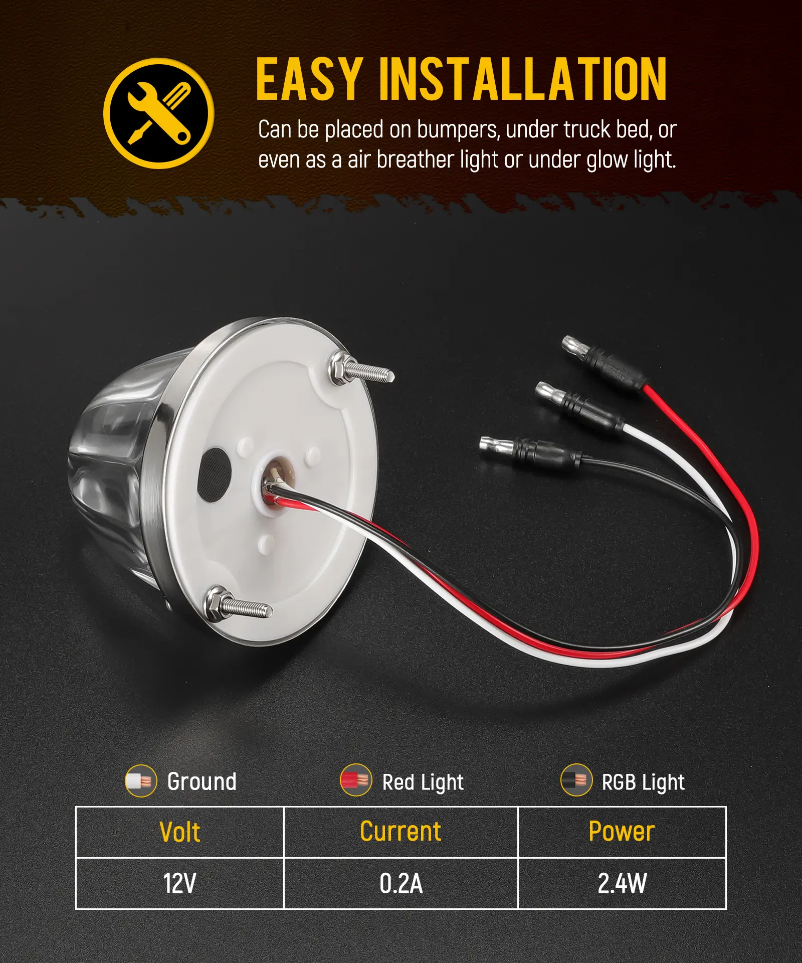 ·[Easy Installation] 3-wire hookup with male bullet plugs for easy installation. White is ground, black is colorful light function as running light, Red is red light function as stop/brake light