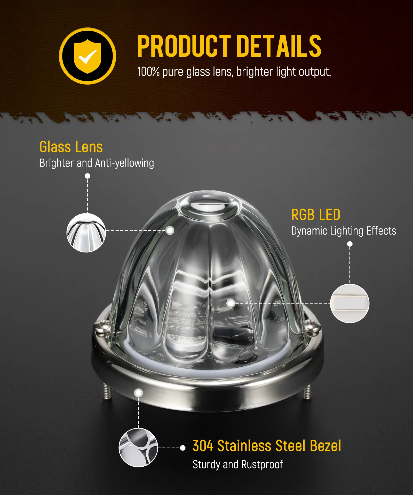 ·[Premium Glass Construction] 100% Pure clear glass lens maximizes light transmission, ensuring the LED light provides optimal brightness and visibility
