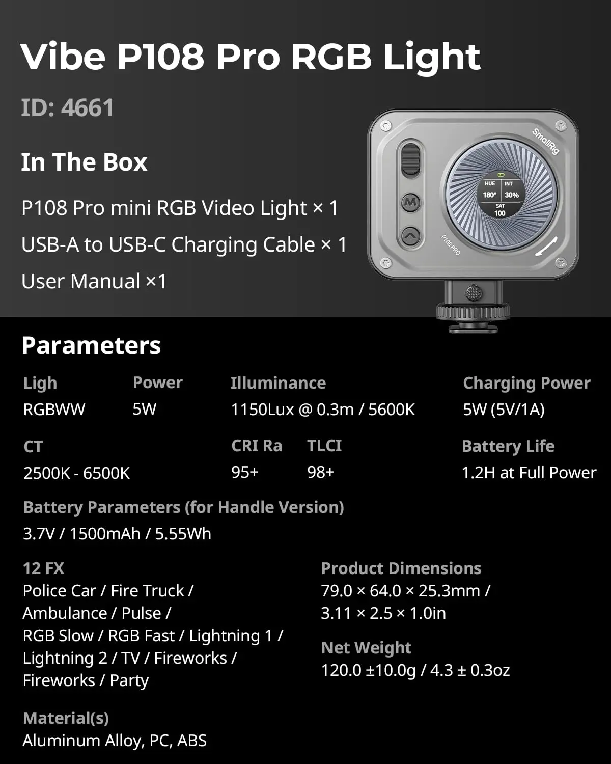 ·New Upgrade: Vibe P108 Pro is the 2nd-generation product in SmallRig's Vibe LED Light series. Inheriting the iconic ring-shaped metal stepless knob design, it now features an embedded LCD color screen for a clear display of parameters such as color temperature and brightness, allowing for easy single-handed adjustment.