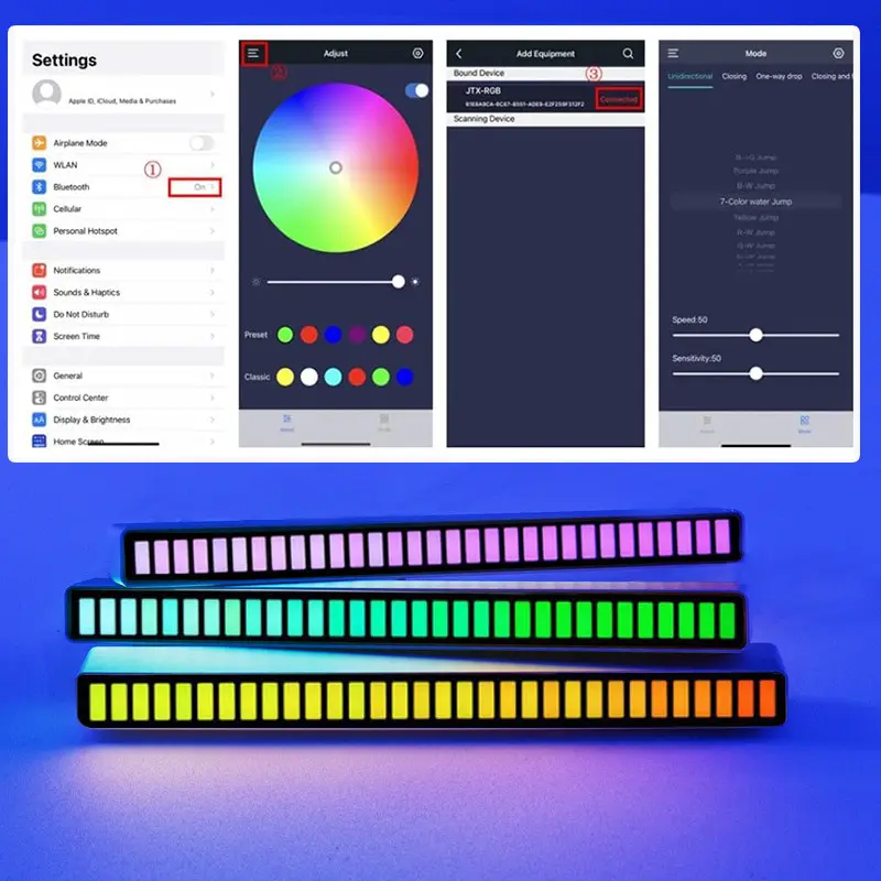 5-speed light flow & 5-level brightness control via intuitive buttons. Short press to switch colors/modes; long press for speed/brightness adjustment. No memory function: Resets to factory mode after power off.
