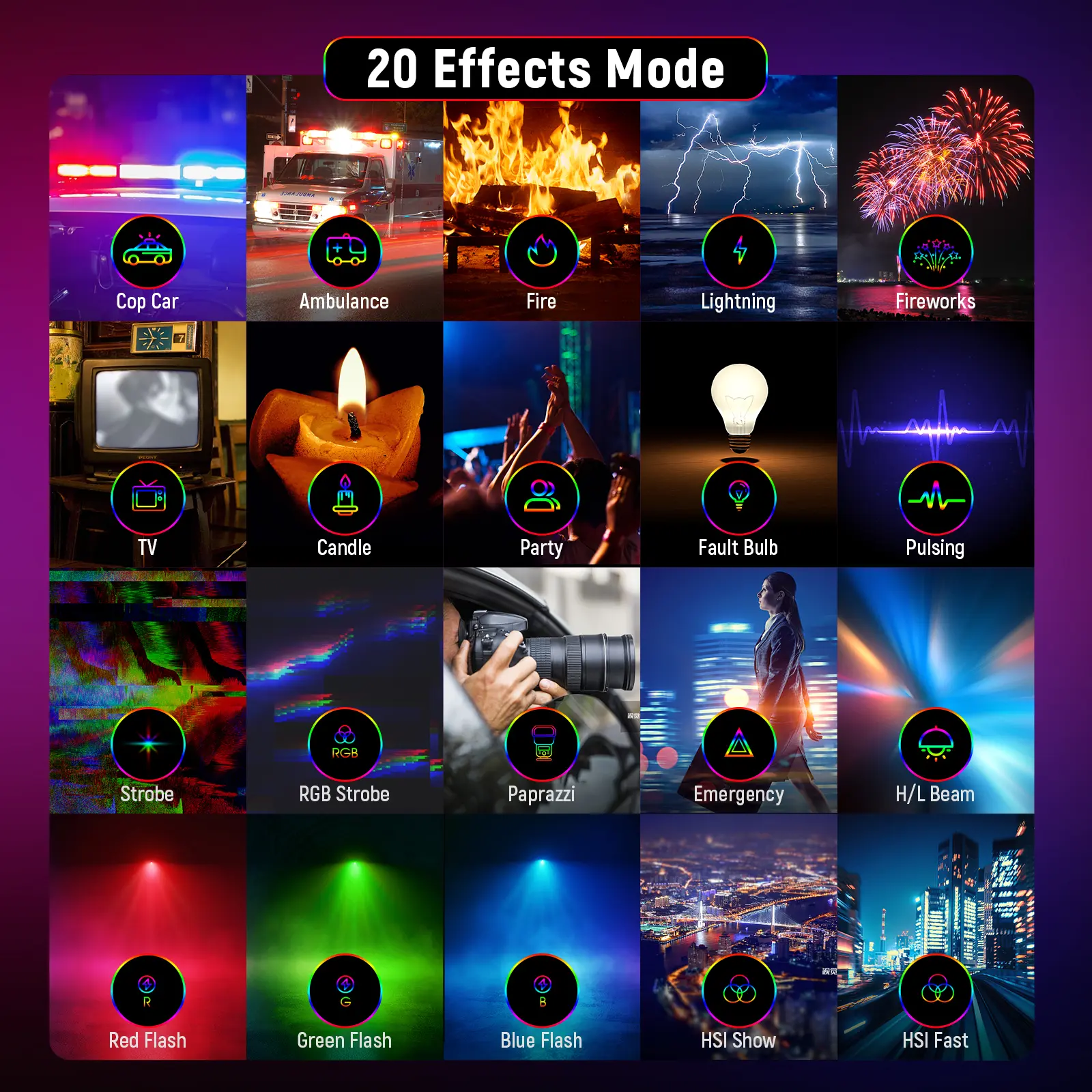 ·20 Scene Modes- There are 20 scene modes for different photography needs, including Cop Car, Ambulance, Fire Truck, Lightning, Fireworks, TV, Candle, Party, Flickering Bulb, Pulsing, Strobe, RGB Strobe, Paparazzi, Emergency, H/L Beam, Red Flash, Green Flash, Blue Flash, HSI Slow, HSI Fast. It can also be used as a very effective fill light. For optimal lighting, keep it close to your subject (within a 6.6'/2m distance)