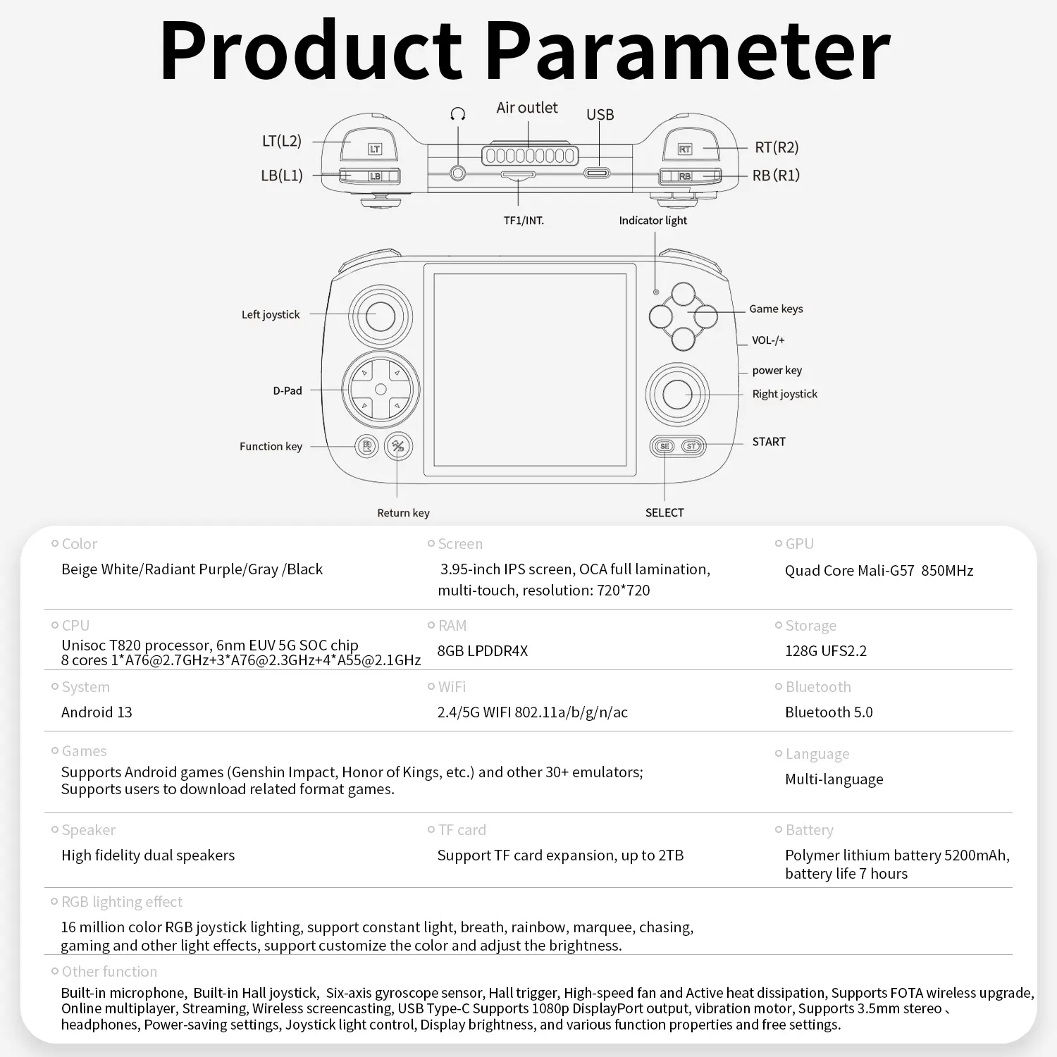 Built-in microphone,Built-in Hall joystick, Six-axis gyroscope sensor, Hall trigger, High-speed fan and Active heat dissipation, Supports FOTA wireless upgrade, Online multiplayer, Streaming, Wireless screencasting, USB Type-C Supports 1080p DisplayPort output, vibration motor, Supports 3.5mm stereo headphones, Power-saving settings, Joystick light control, Display brightness, and various function properties and free settings.