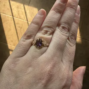 Ring looked beautiful at first. I only wore it one day and 3 of the small side gems fell off. Plus the top purple stone was very crooked.