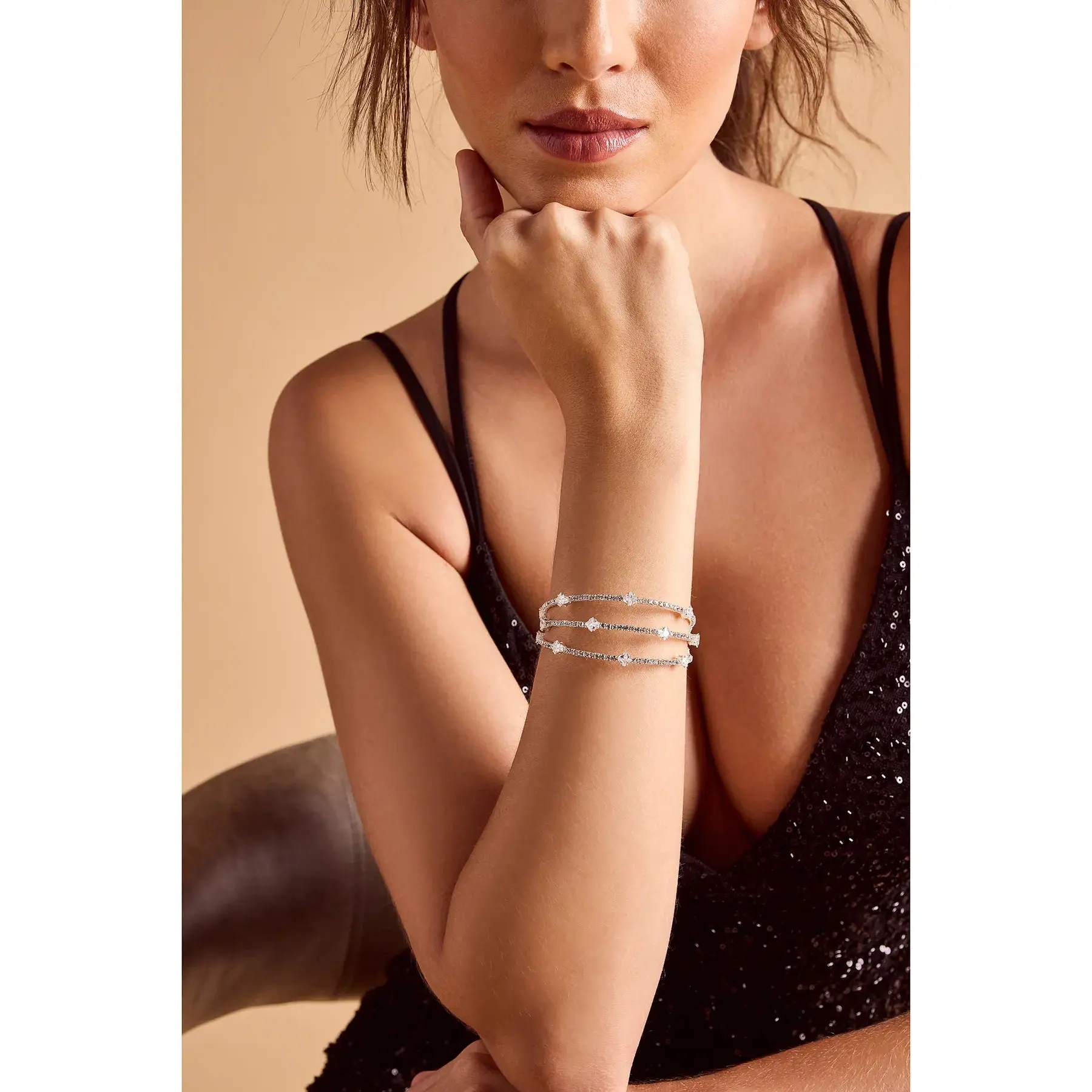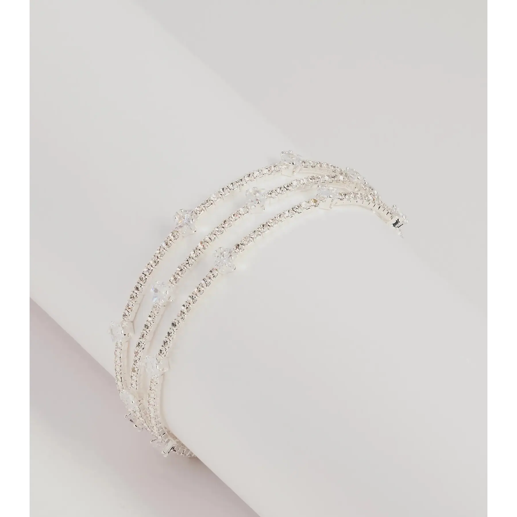 This memory wire bracelet features dazzling rhinestone embellishments on a three-row design. Perfect for styling with earrings.
