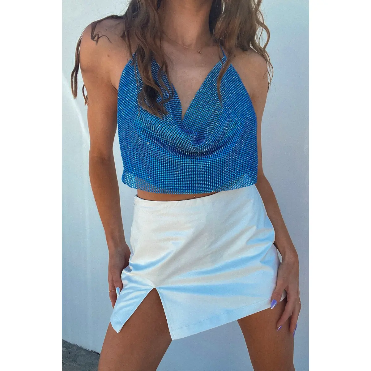 Time to sparkle in the Ana Rhinestone Mesh Crop Top! This shimmering halter top features a cowl neckline with an adjustable tie at the neck and back. Available in blue, silver, and gold. Pair with some trendy bottoms for the perfect festival look!