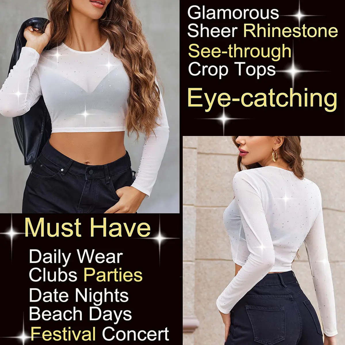 ·【Versatile Style】Rhinestone mesh top, going out tops, y2k long sleeve crop top, transparent blouse, party crop top, evening wear top. Perferct for casual and daily wear, parties, clubs, date nights, nights out, beach days, concerts or festival. Elevate your wardrobe with this pretty mesh top, making it the best choice for thoughtful gifts.