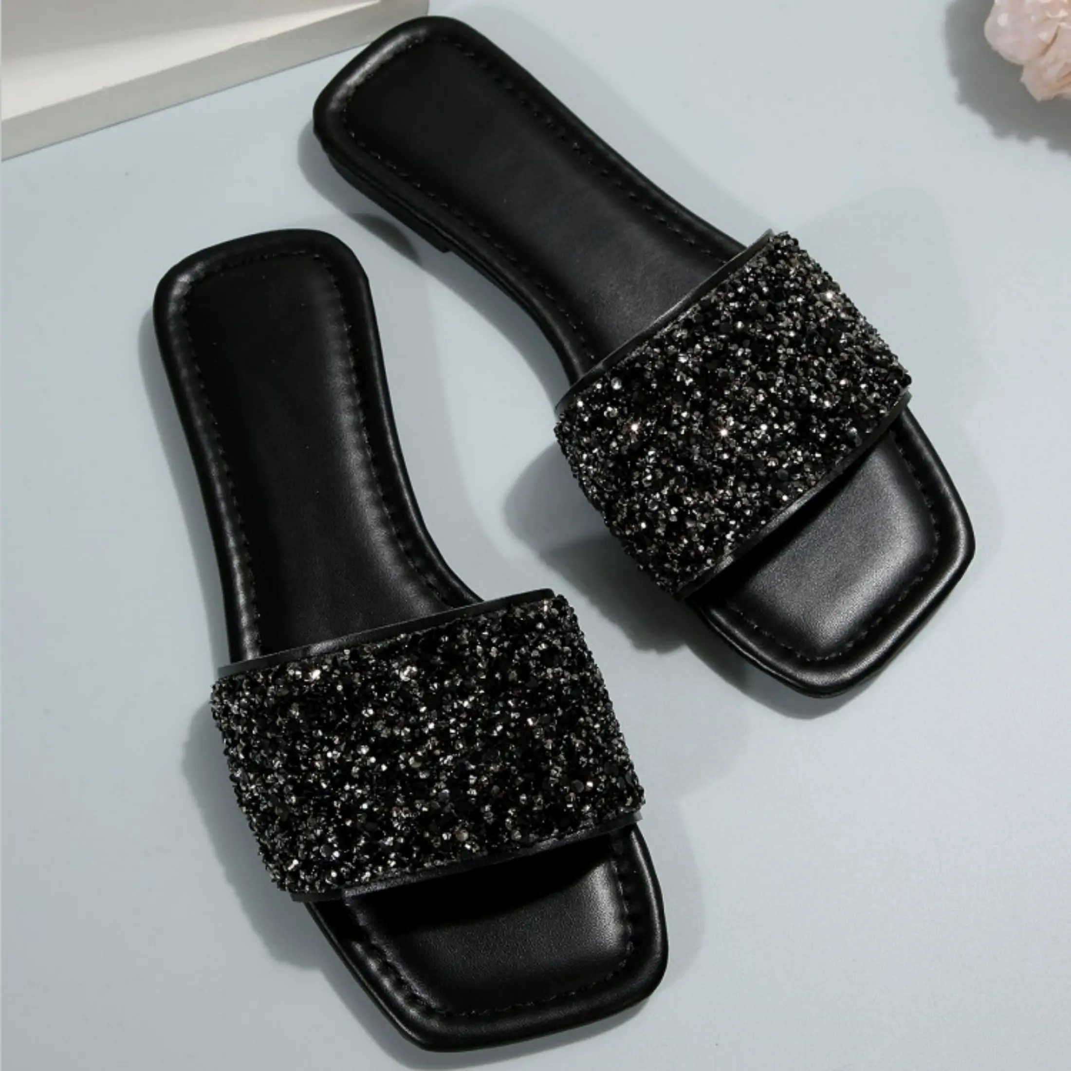 5. Women's Fashion Rhinestone Slide Sandals Open Summer Dressy Slippers Square Toe Slip On Flat Sandals