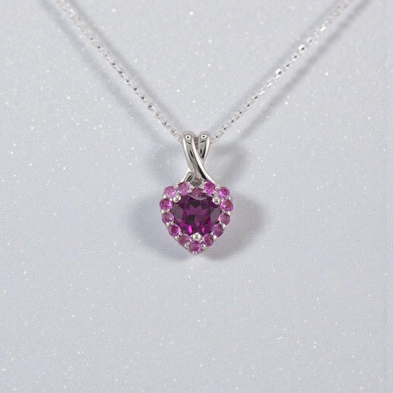 5. Sterling Silver Rhodolite Garnet Heart and Pink Sapphire Halo Pendant Necklace
