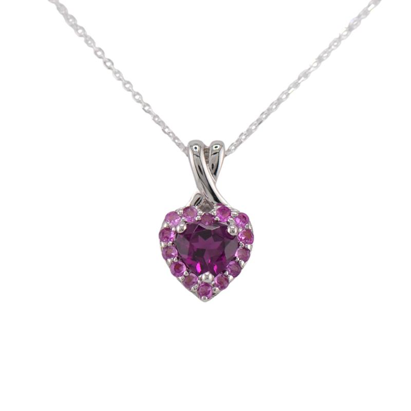 Sterling Silver Rhodolite Garnet Heart and Pink Sapphire Halo Pendant Necklace