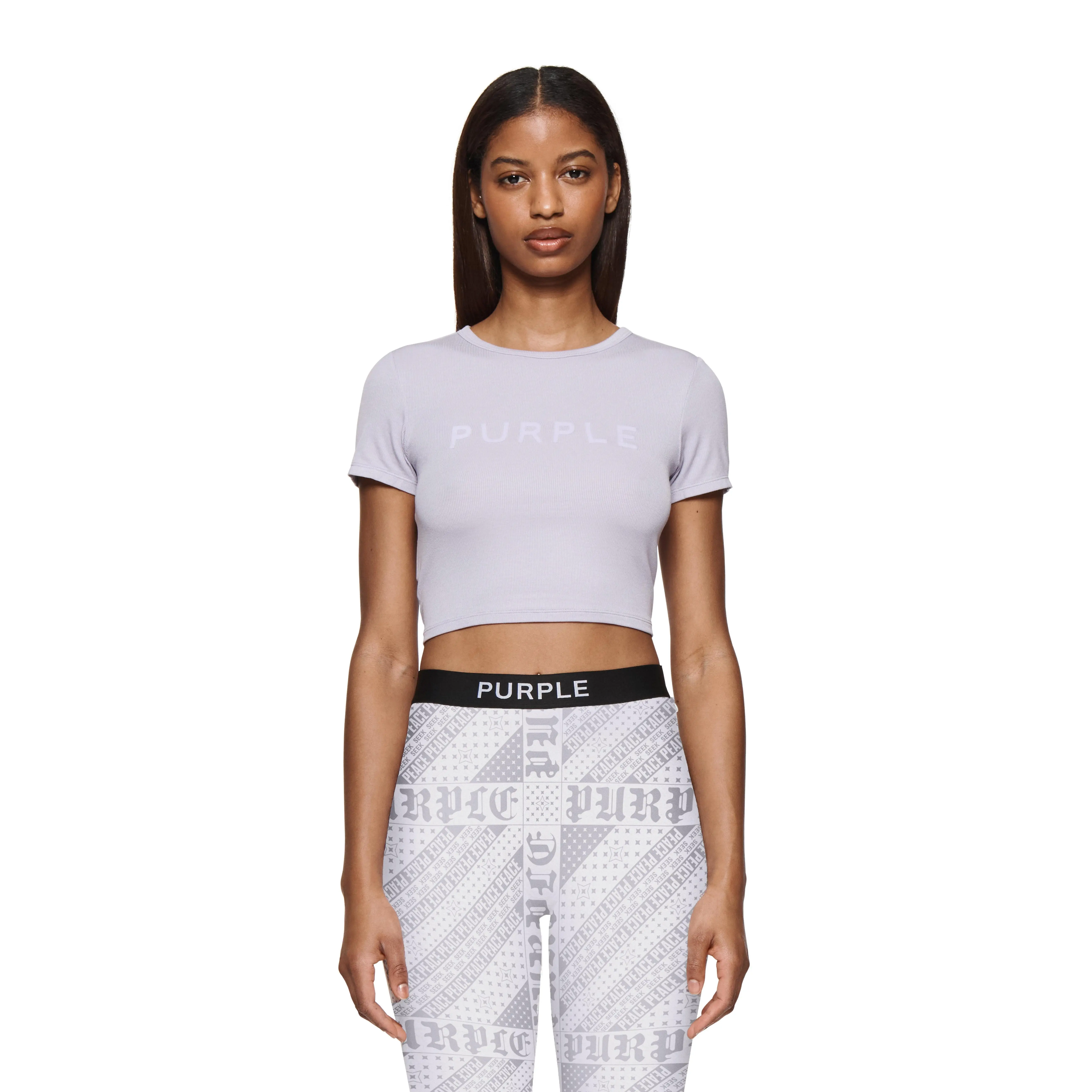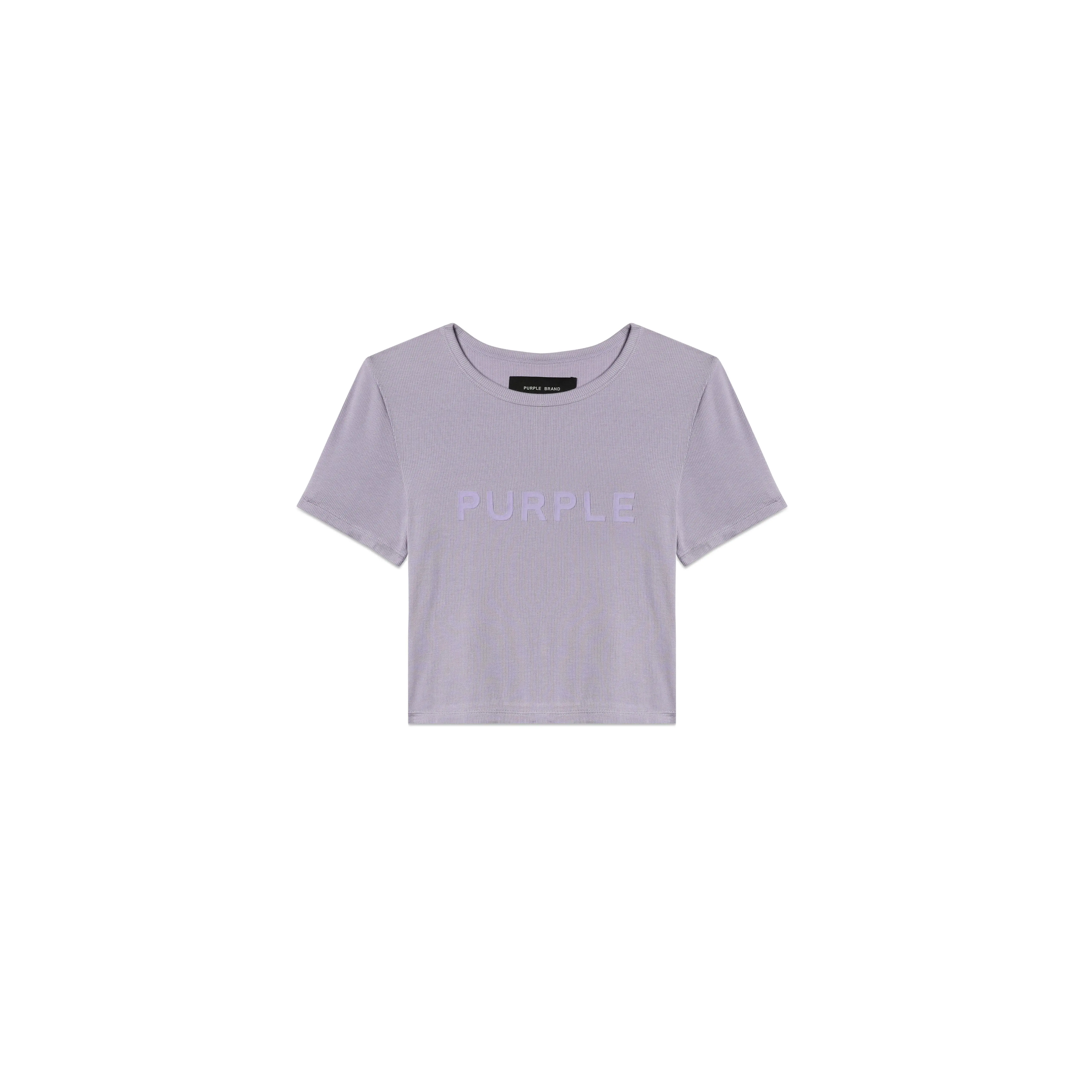Tailored to a shrunken, cropped fit, this crewneck tee comes in a lavender ribbed knit with tonal Purple Brand logo block lettering across the chest.