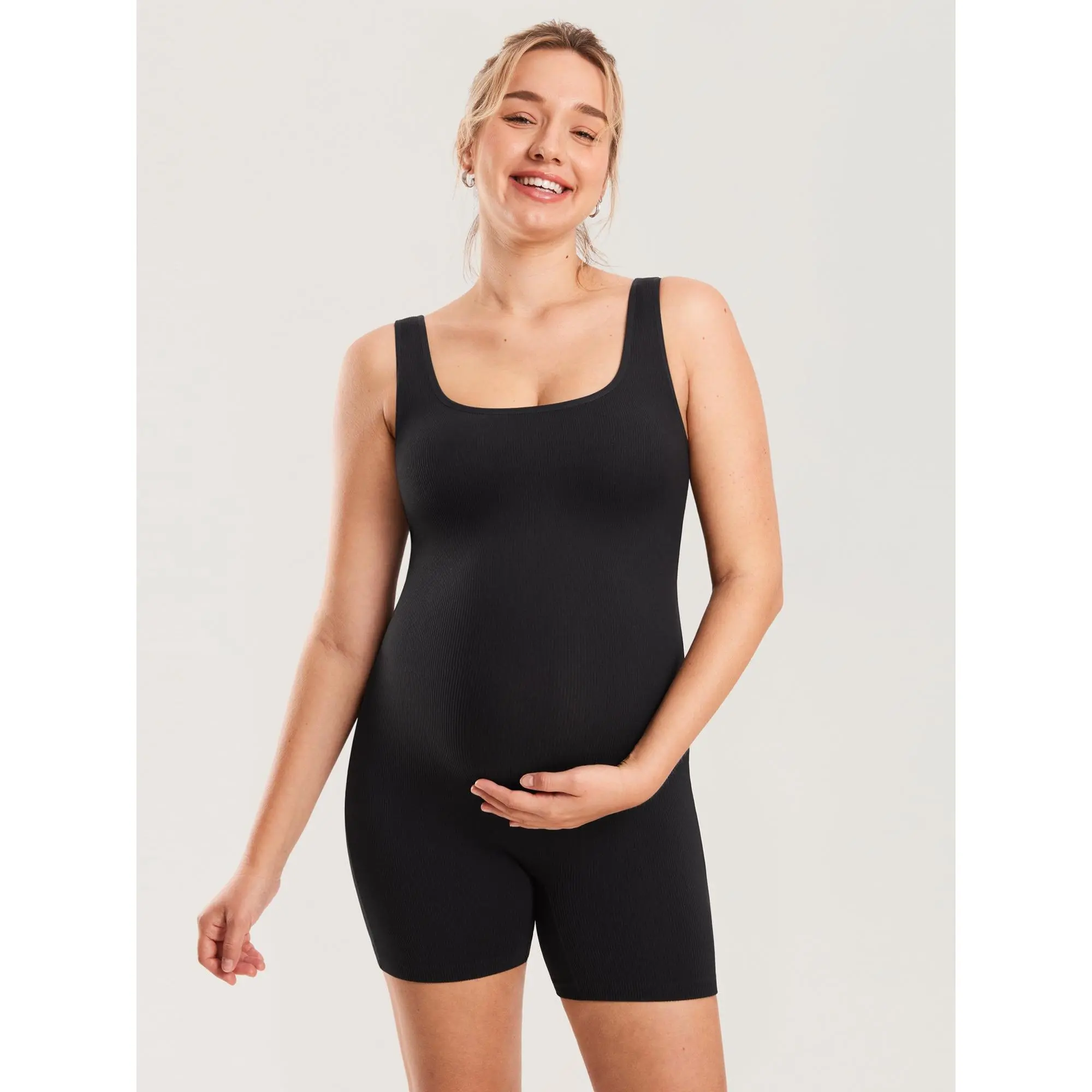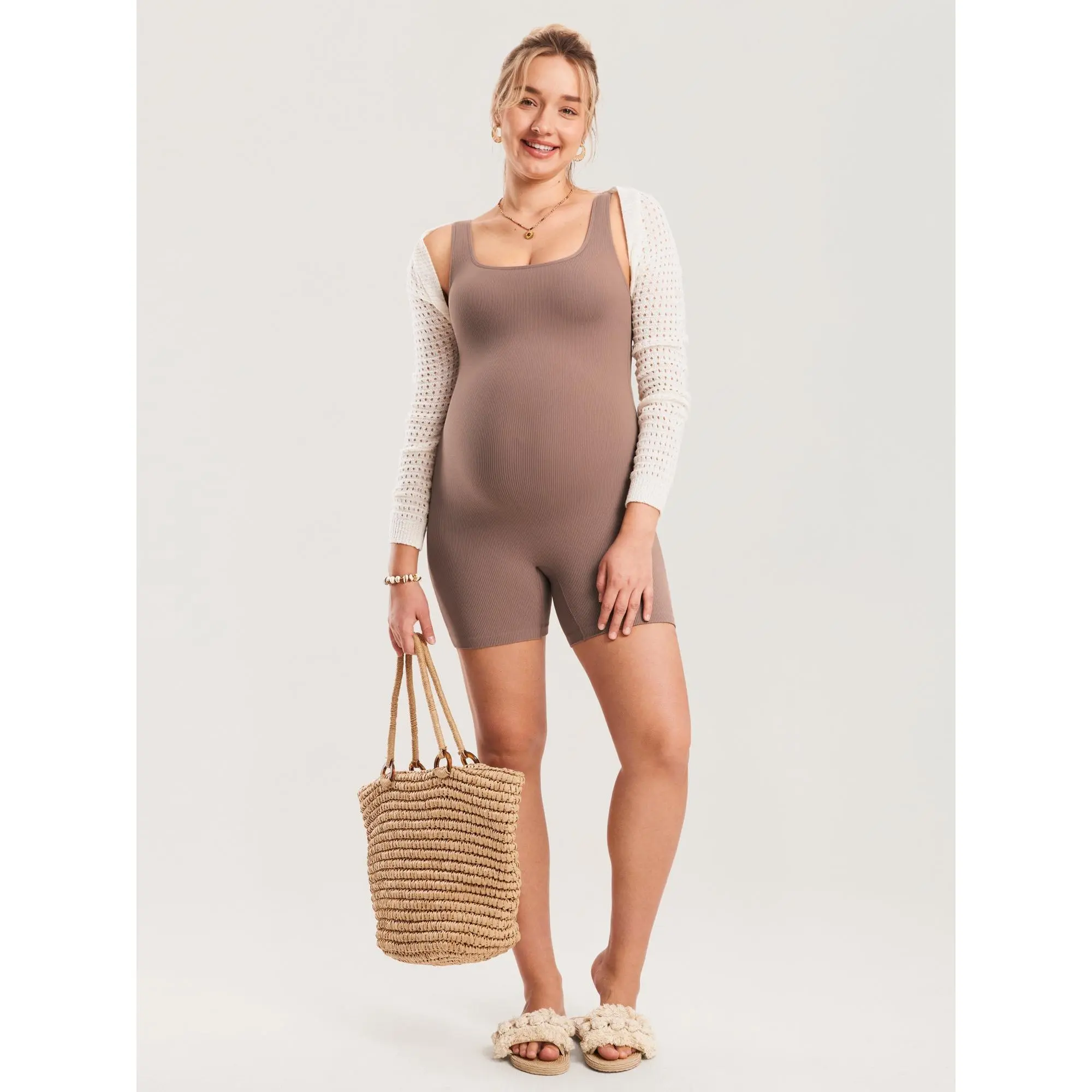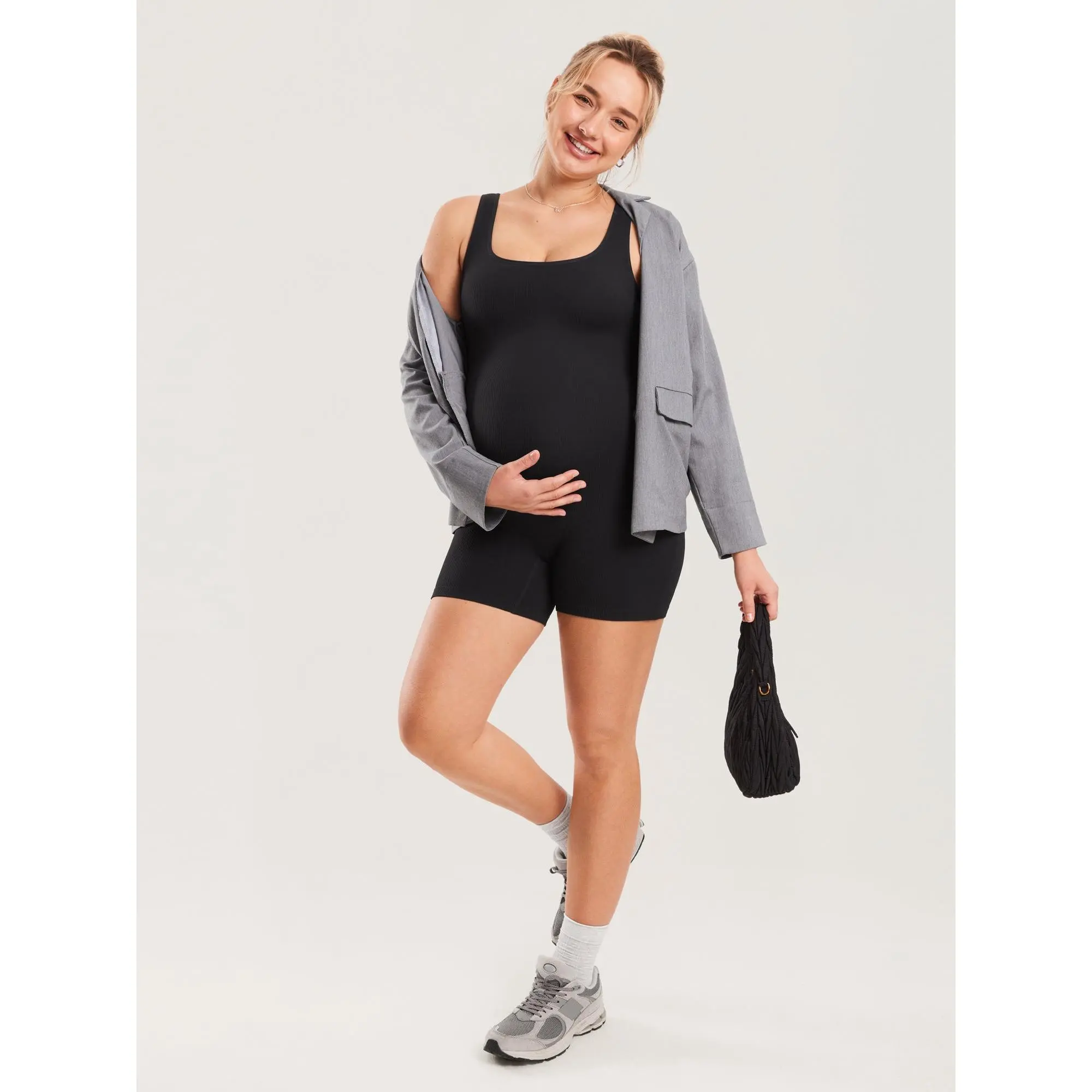 This ribbed maternity romper blends comfort and style. Soft, stretchy ribbed fabric hugs your growing bump, while wide straps and a double-layer front (with removable padding) offer bra-free comfort. Roomy belly space and slim fit design for all-day ease, perfect for homewear, outings or maternity photoshoots.[[cur-off]][[flare]]{{Details}}