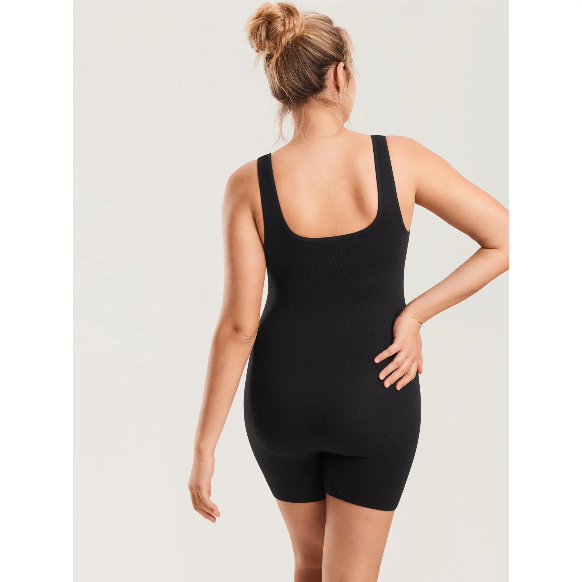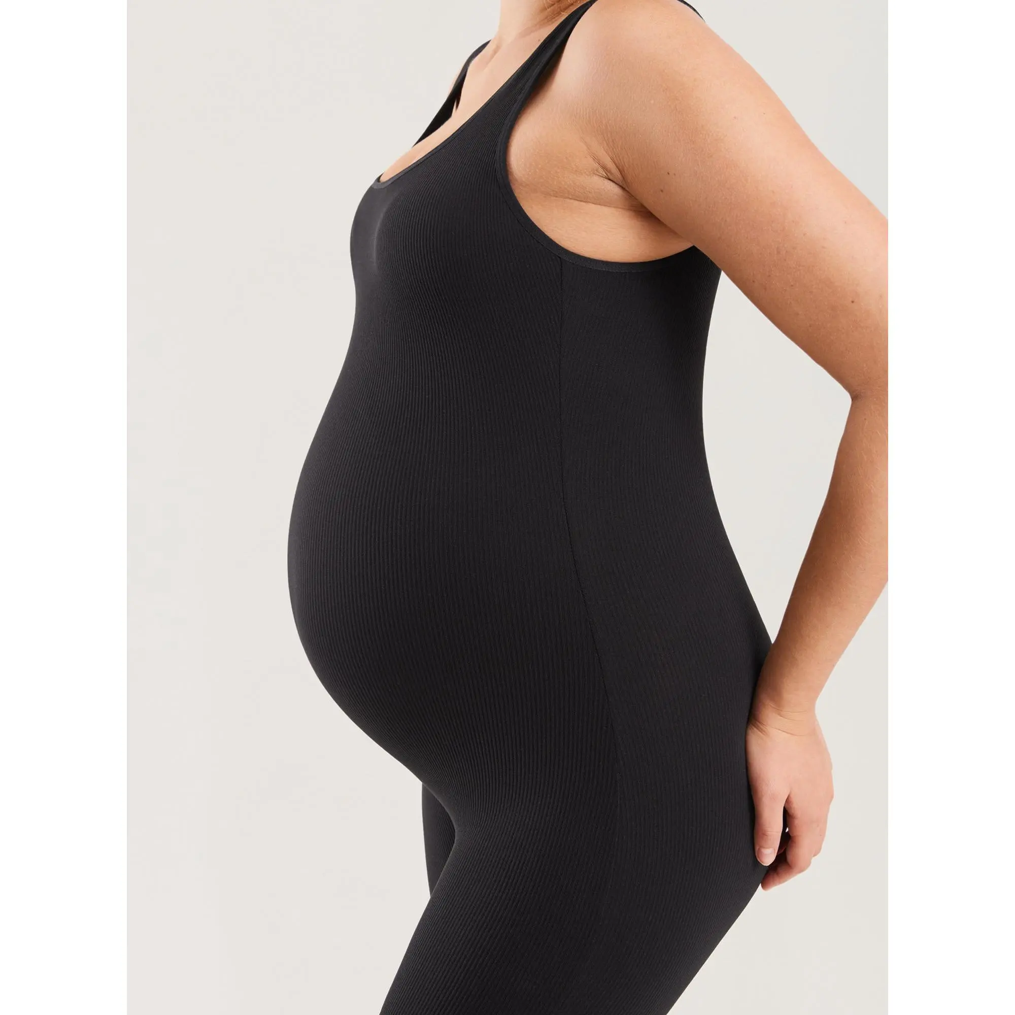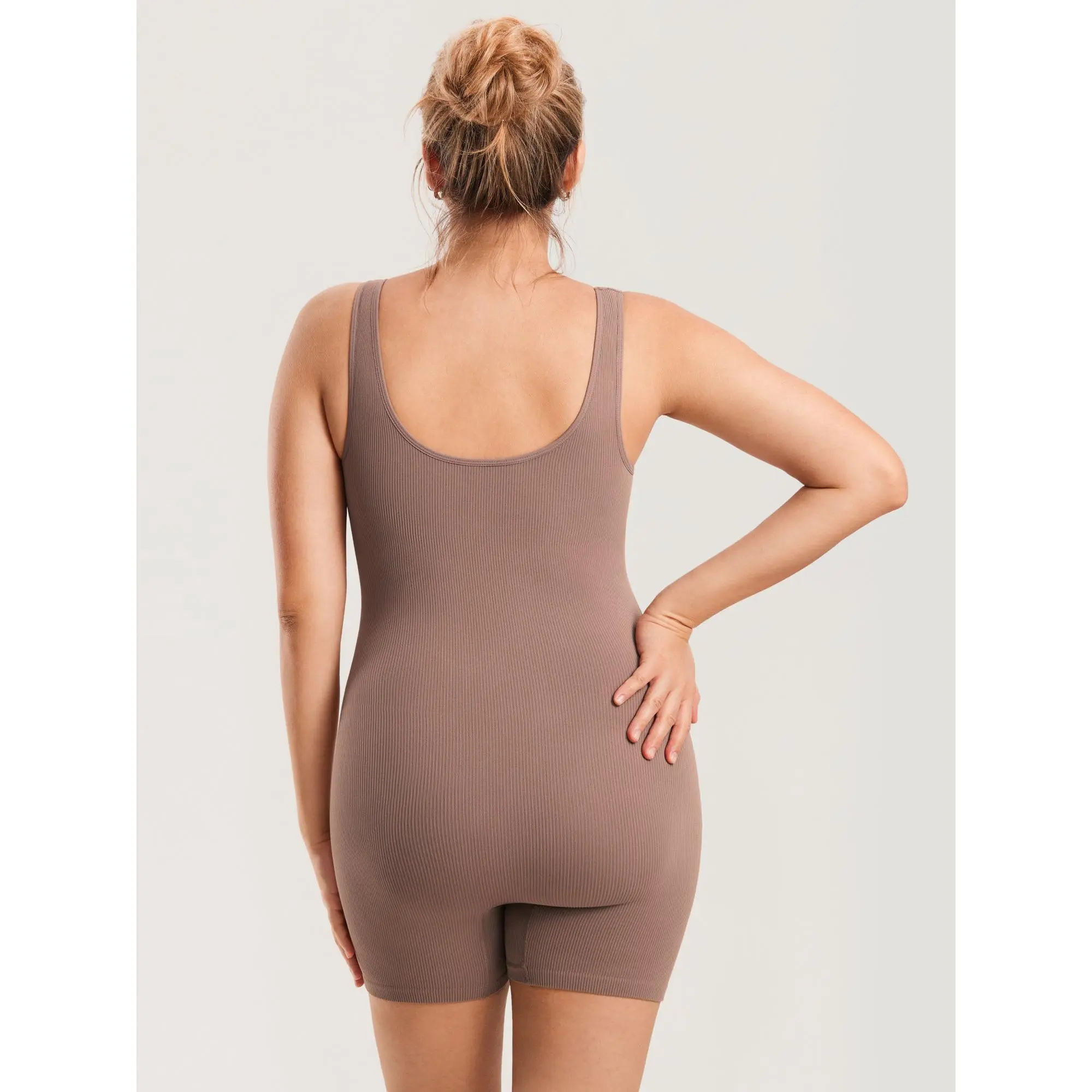 This ribbed maternity romper blends comfort and style. Soft, stretchy ribbed fabric hugs your growing bump, while wide straps and a double-layer front (with removable padding) offer bra-free comfort. Roomy belly space and slim fit design for all-day ease, perfect for homewear, outings or maternity photoshoots.[[cur-off]][[flare]]{{Details}}