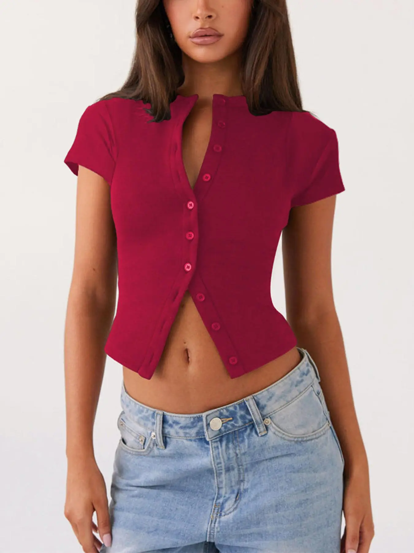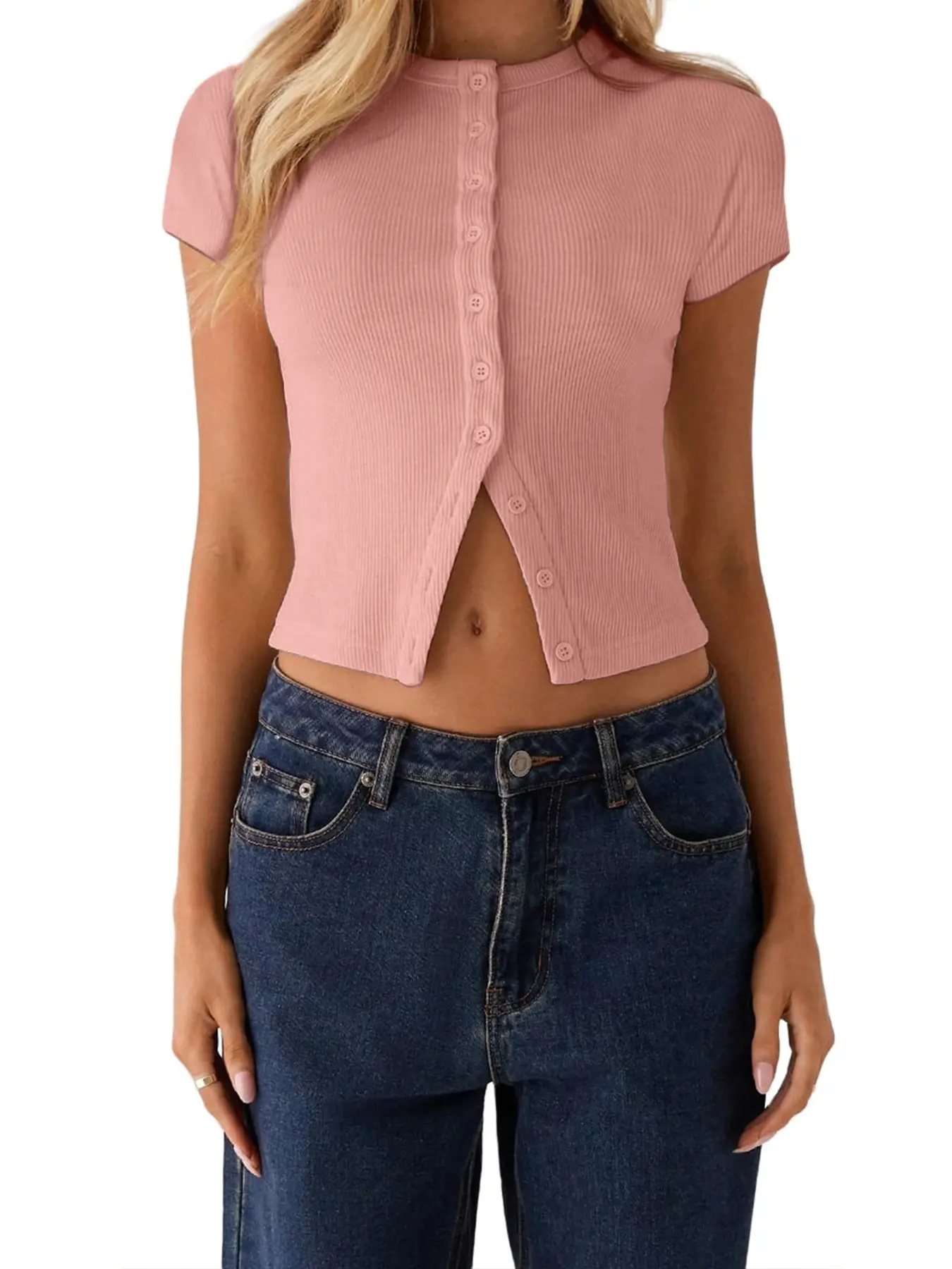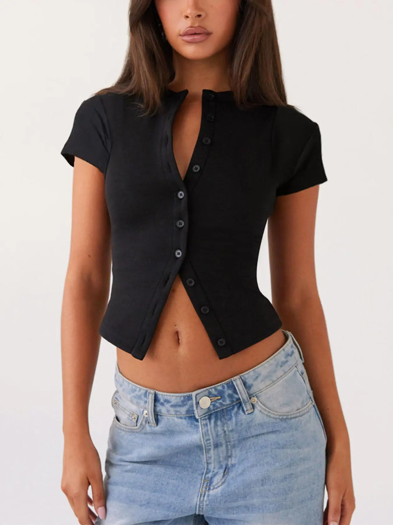 Women's Plain Button Front Ribbed Tee, Casual Slim-fitting Short Sleeve T-shirt for Daily Wear, Ladies Clothes for All Seasons, Cute Basic Tops, Womenswear