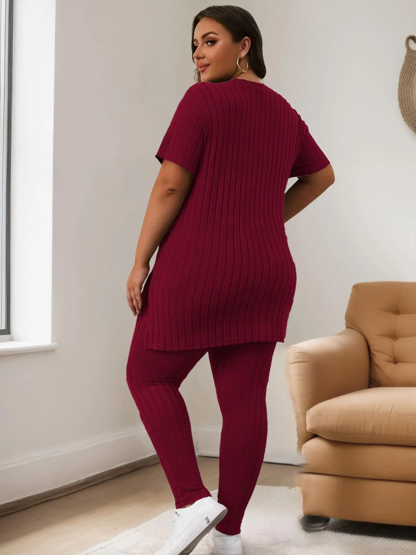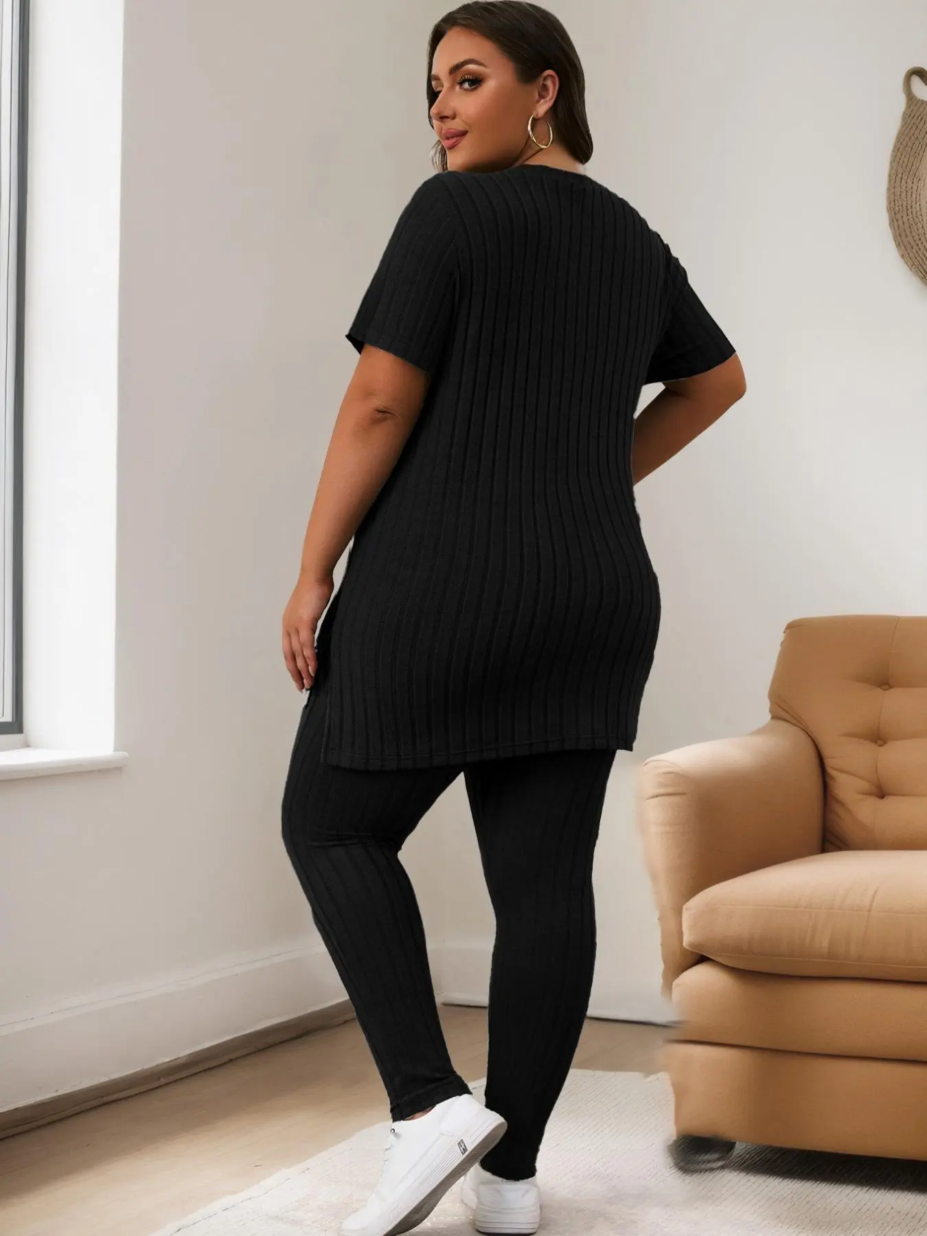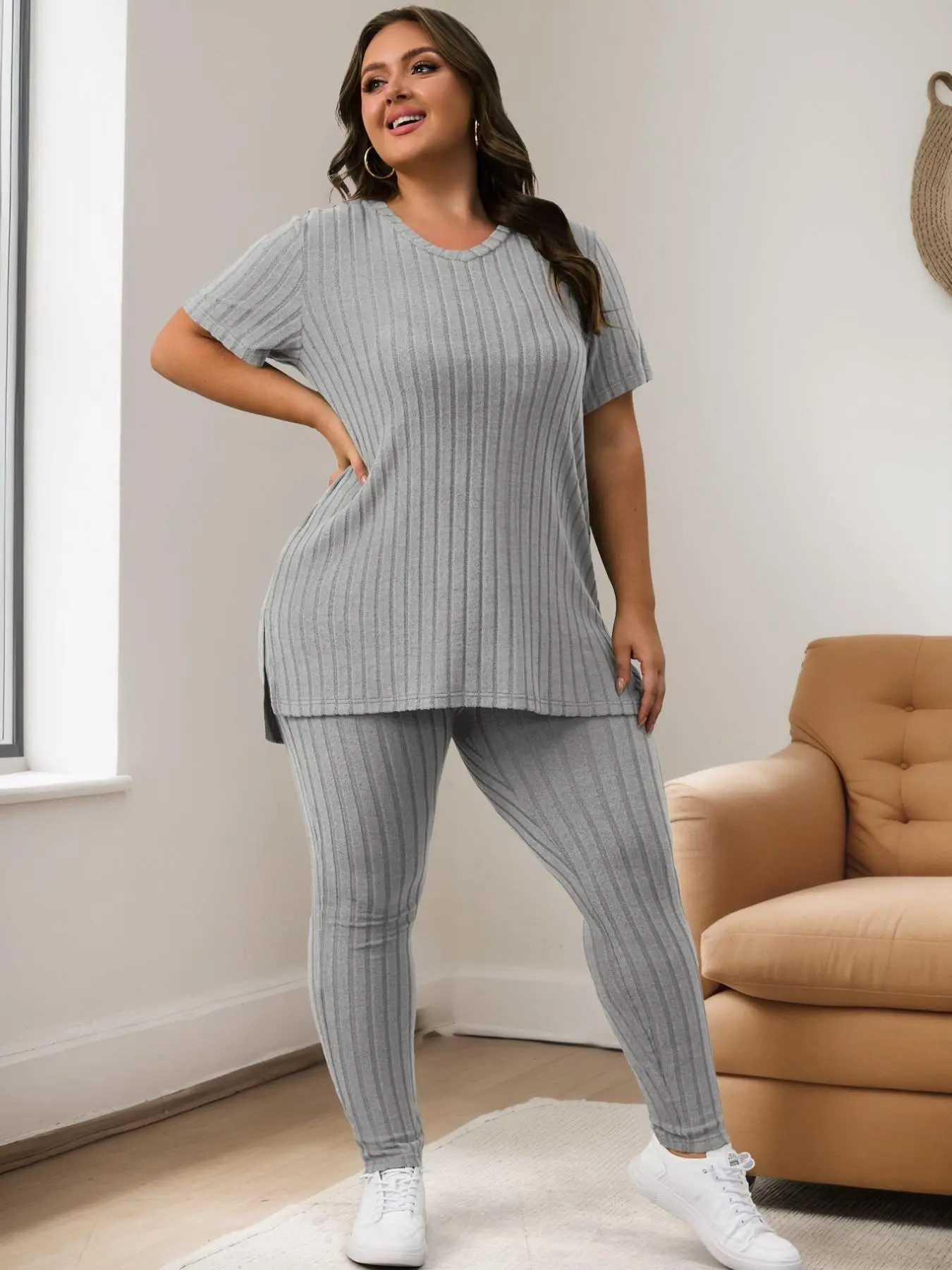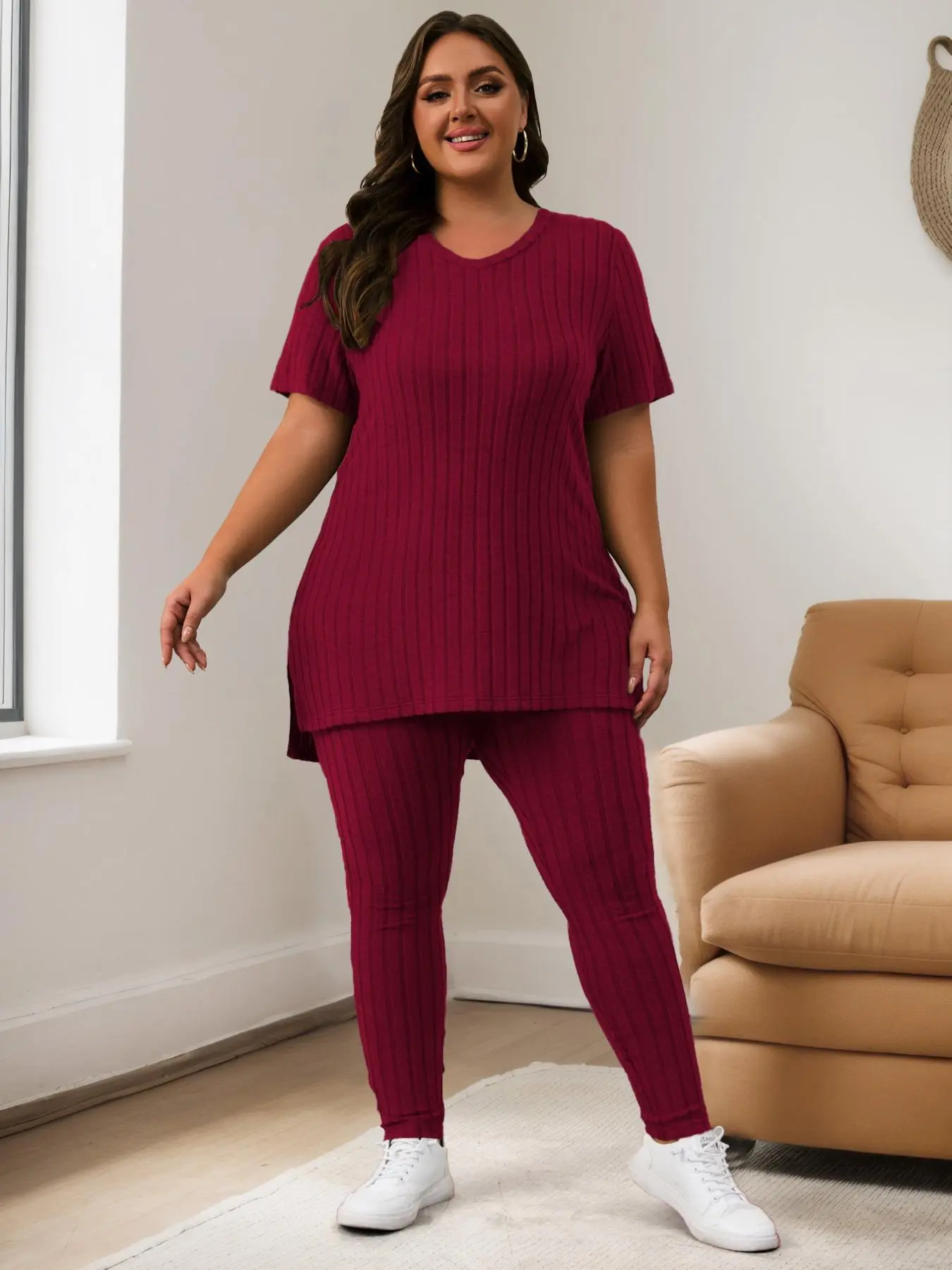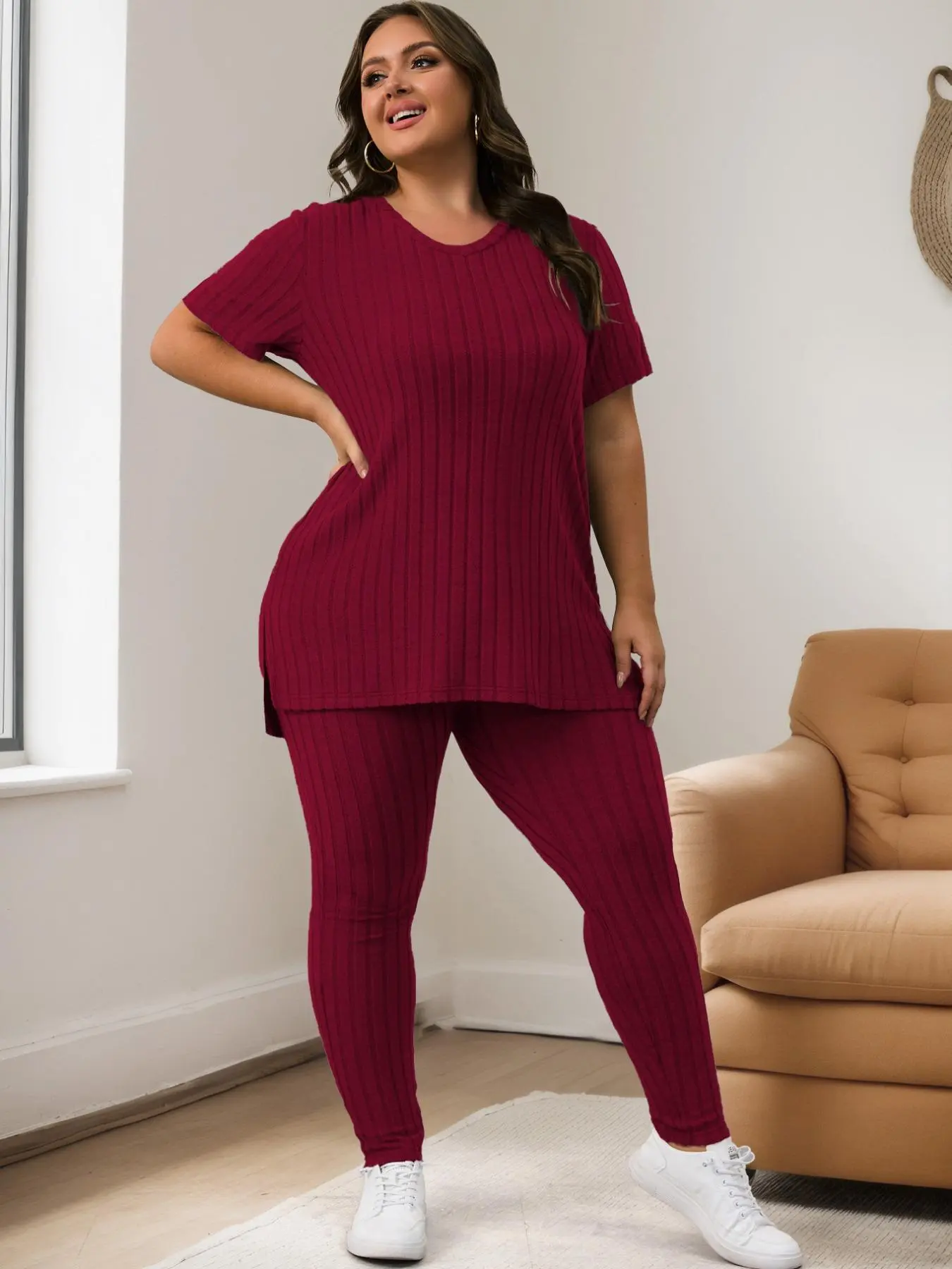 Women Plus Size Ribbed Tee & Elastic Waist Pants Set, Casual Fashion Cozy Two-Piece for Summer, Daily Outdoor Wear #loungewear #womenssweatshirtset #womens2piecesets #plussizefashioninspo #ootdplussize #plussizesweaters #usloungewearlooks #plussizesweats #womensoutfitideas #bodypositiveloungewear