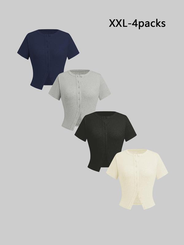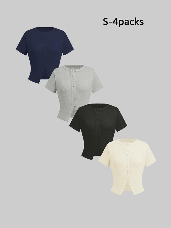 5. Women's Plain Button Front Ribbed Tee Set, Casual Chic Minimalist, Casual Short Sleeve T-shirt for Daily Wear, Ladies Clothes for All Seasons
