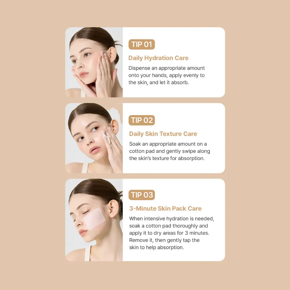 ·Soak a cotton pad, place on dry areas for 3 minutes, then pat in the remaining essence for plump, glowing skin.