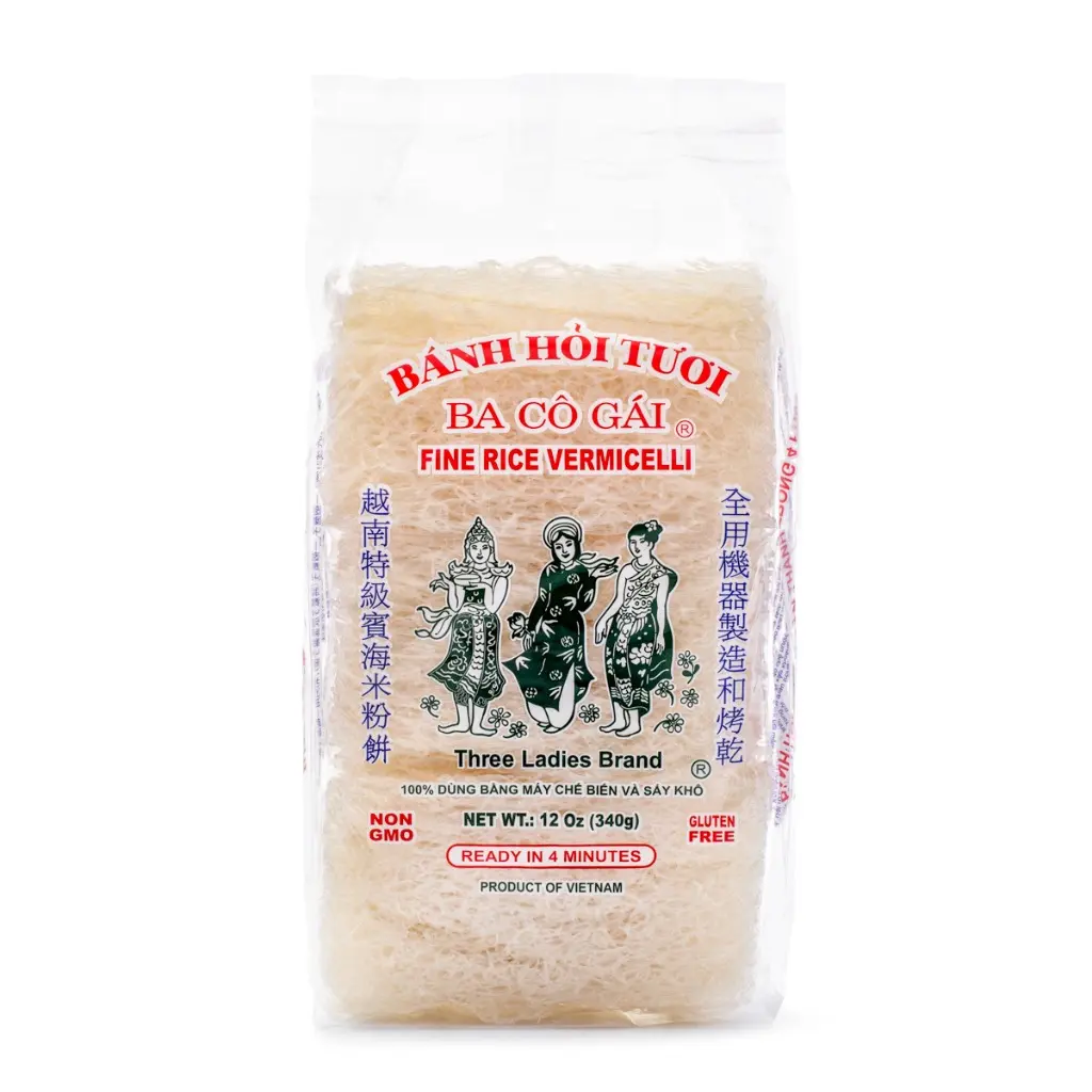 Three Ladies Brand authentic fine rice vermicelli noodles, Bánh Hỏi Tươi, ready in just 4 minutes! Great for any noodle dish paired with Vietnamese Bbq, seafood, or deep-fried eggrolls. To serve, drizzle with scallion oil, add Vietnamese herbs, and enjoy with nước chấm!