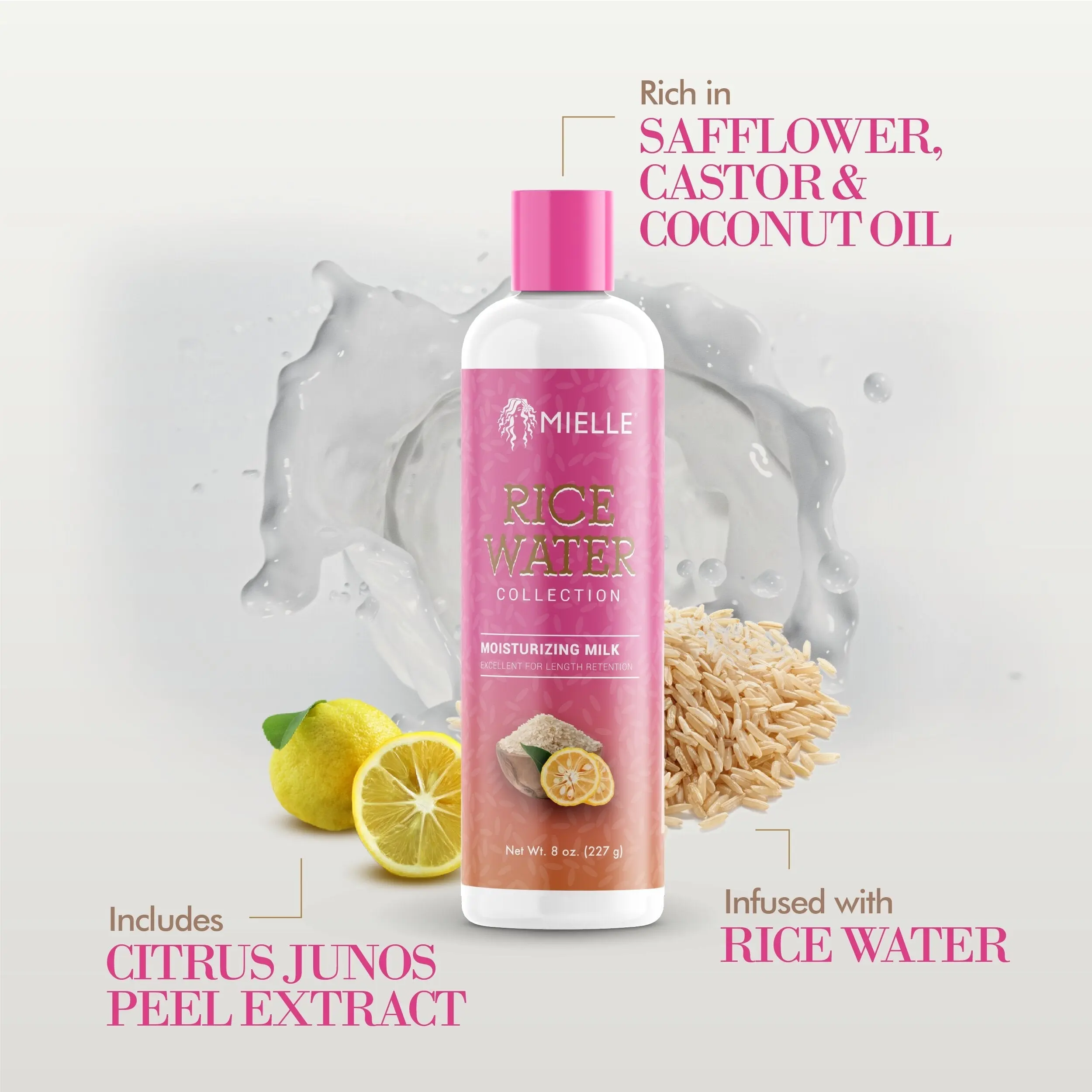 Infused with key ingredients such as safflower oil, rice water for hair, yuzu, castor oil and coconut oil to strengthen and lock in moisture. This daily moisturizer is the perfect solution for bringing life back to dry thirsty hair.