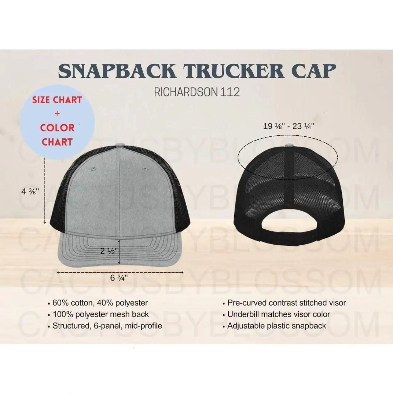 - Brand: Richardson 112 Trucker Hat- 60/40 cotton/polyester