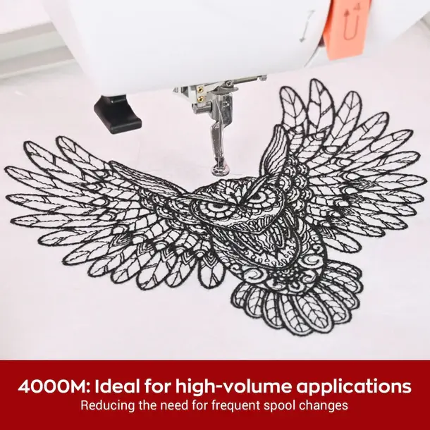 4000M Polyester Machine Embroidery Thread. Each spool has 40 W.T. (120D/2). ONE 4374Y spool equals four 1000Y spools! Lasts longer, no need to pause. ONE pack includes four huge spools. 🧶