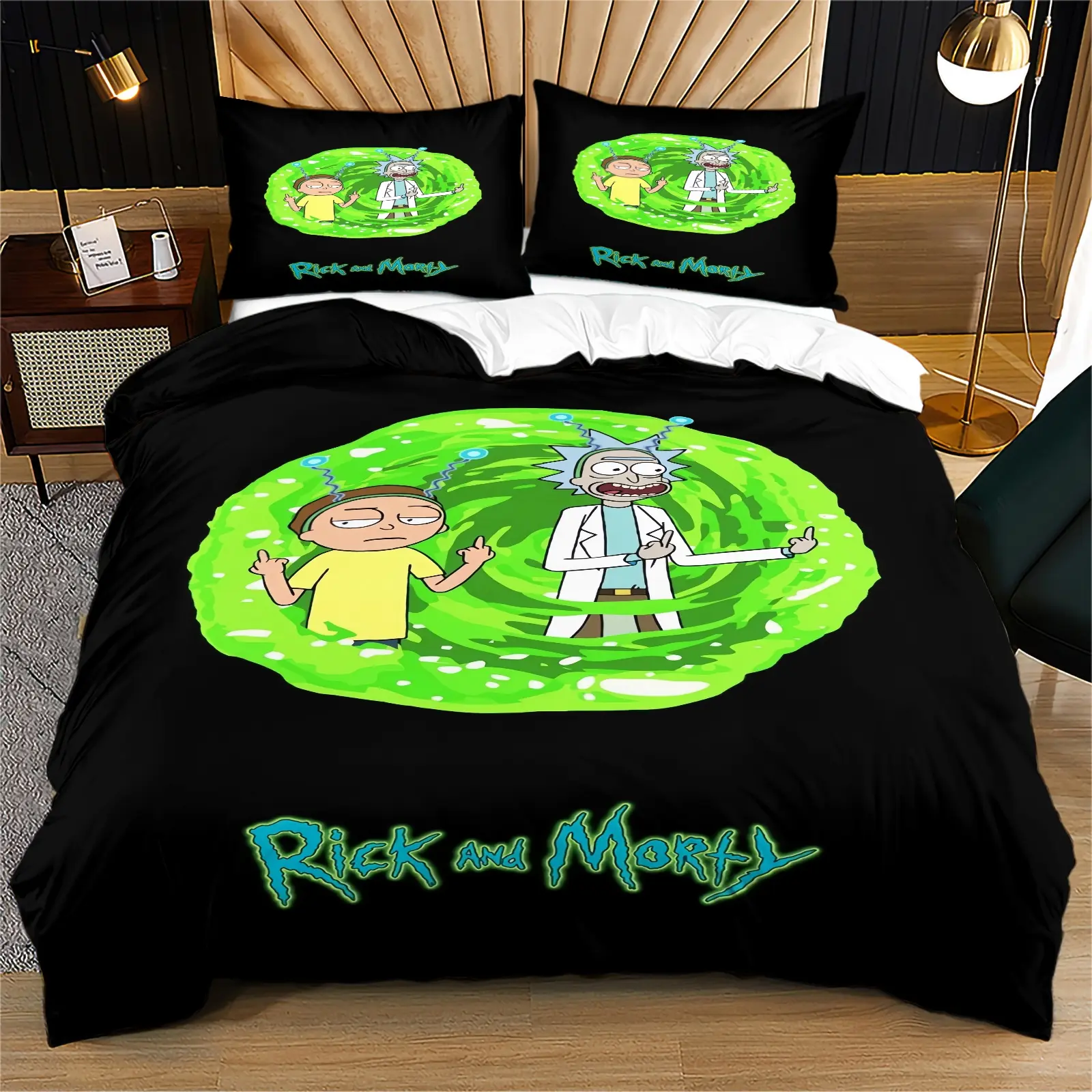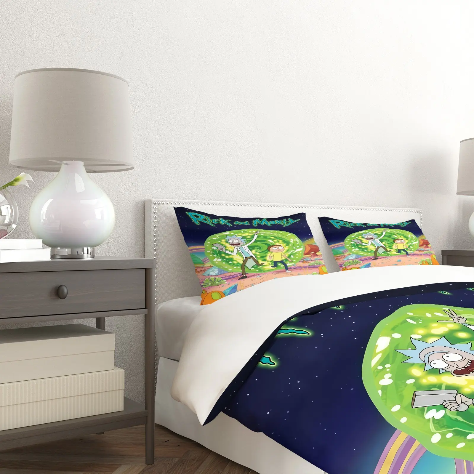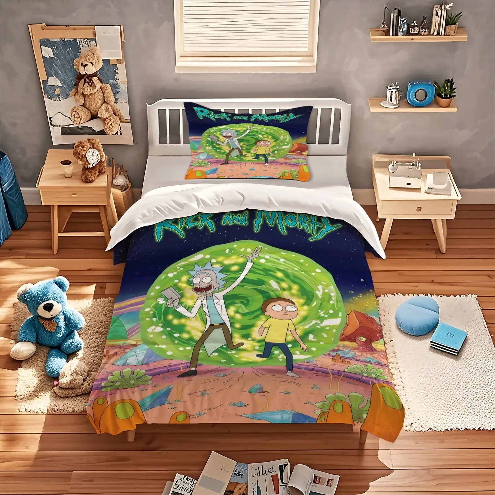 Rick and Morty Pattern Printed Soft Durable Bedding Set, Bed Sheets Set, Includes 1 Fitted Sheet and 1 or 2 Pillowcases, Excluding The Core And Pillow Core, Modern Style Bedroom Decor, Bed Sheet Sets