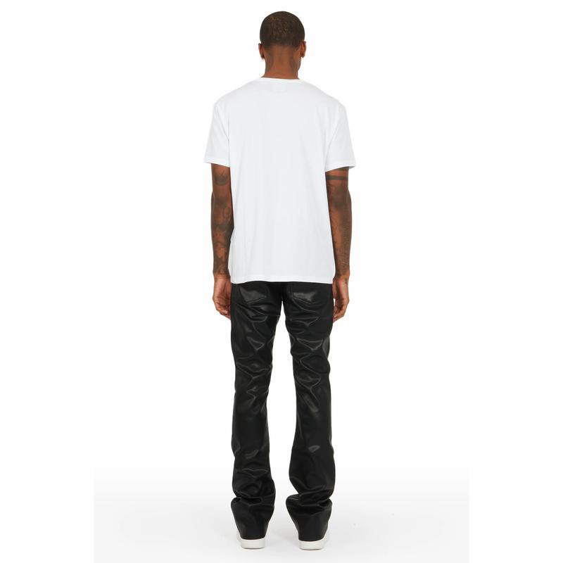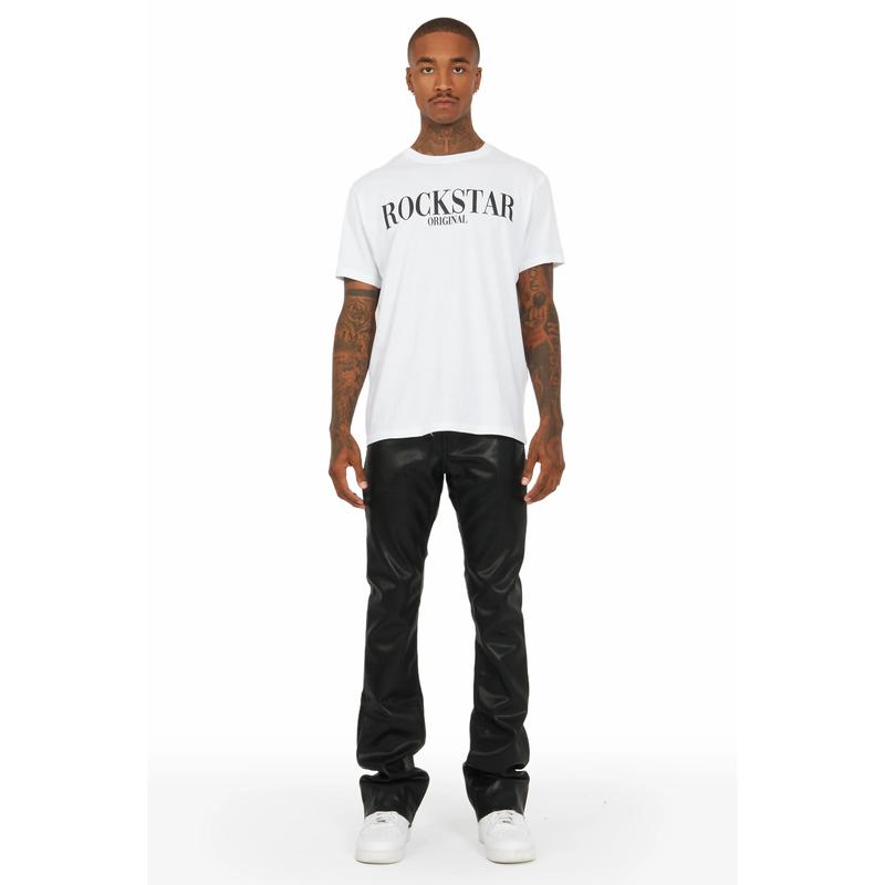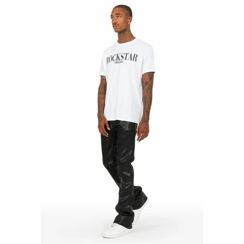 An elevated stacked flare jean for men in black. Designed with PU fabric and a custom Rockstar Original belt loop chain for a must-cop streetwear style.