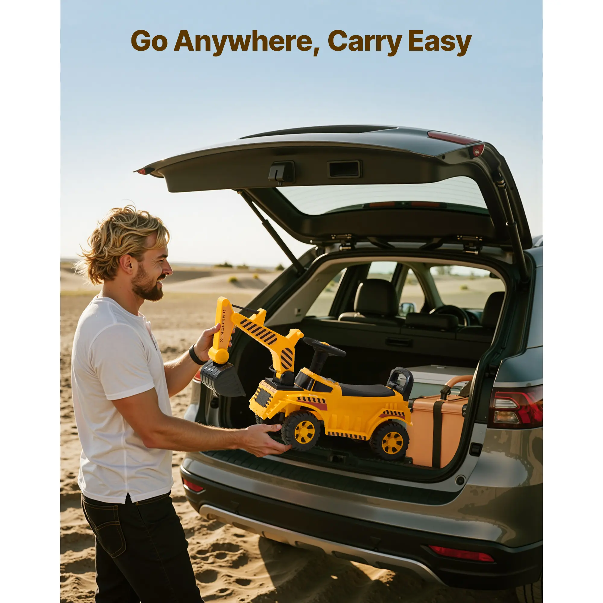 • Mini Crane Operator: With the control lever, kids can raise and lower the digger arm, steer with the wheel, and enjoy realistic "Chug-chug" sounds. Complete with a security helmet, our ride on car is the ideal way to develop hand-eye coordination through play