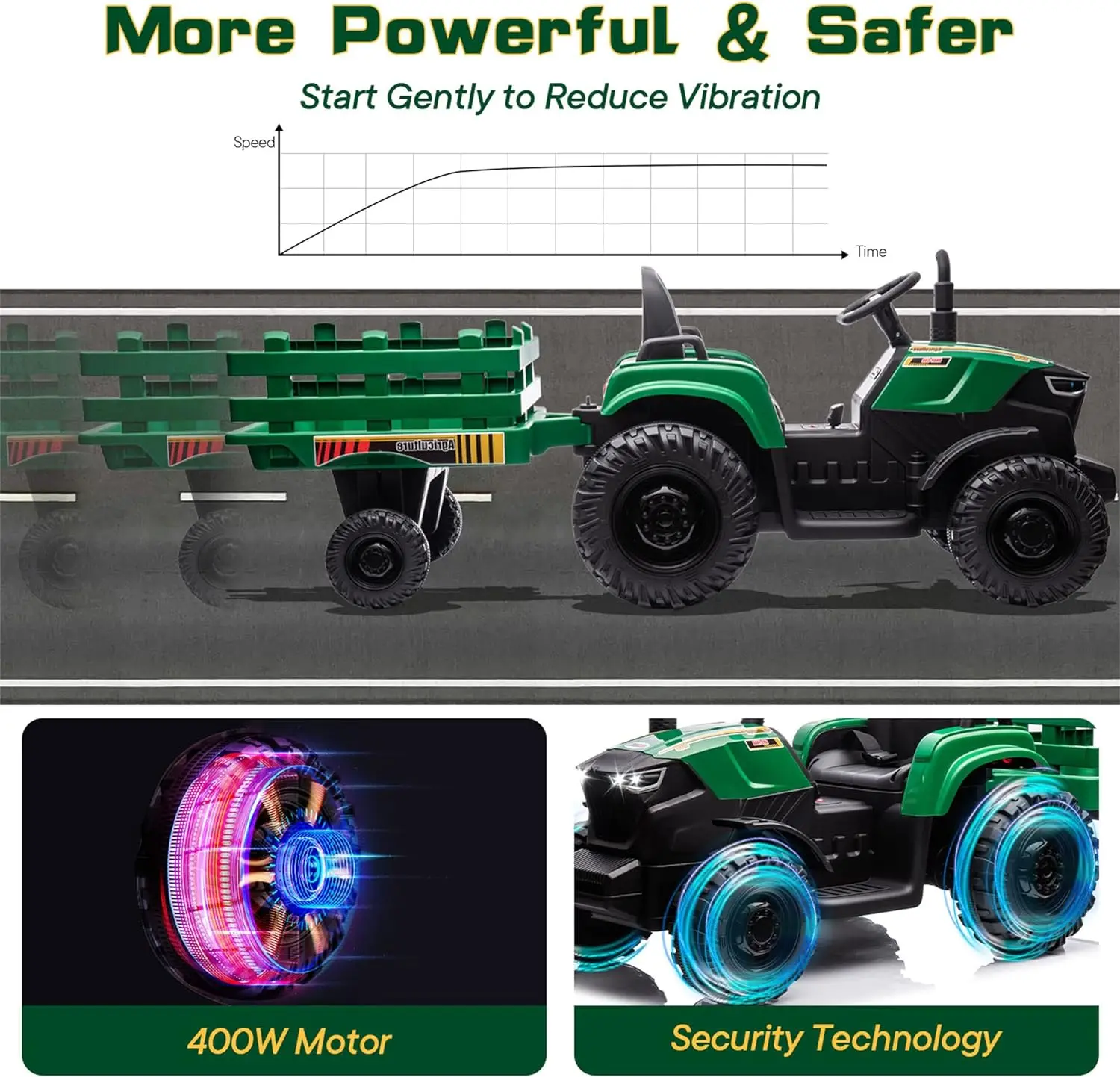 ·POWERFUL PERFORMANCE: The large electric tractor car is powered by a 24Volt/9Ah lead acid battery, which ensures about 1.5 hours of playtime after being fully charged. With 2*200W motors, it can reach speeds between 1.8-5.0 mph, making it capable of carrying kids and a large trailer with ease.
