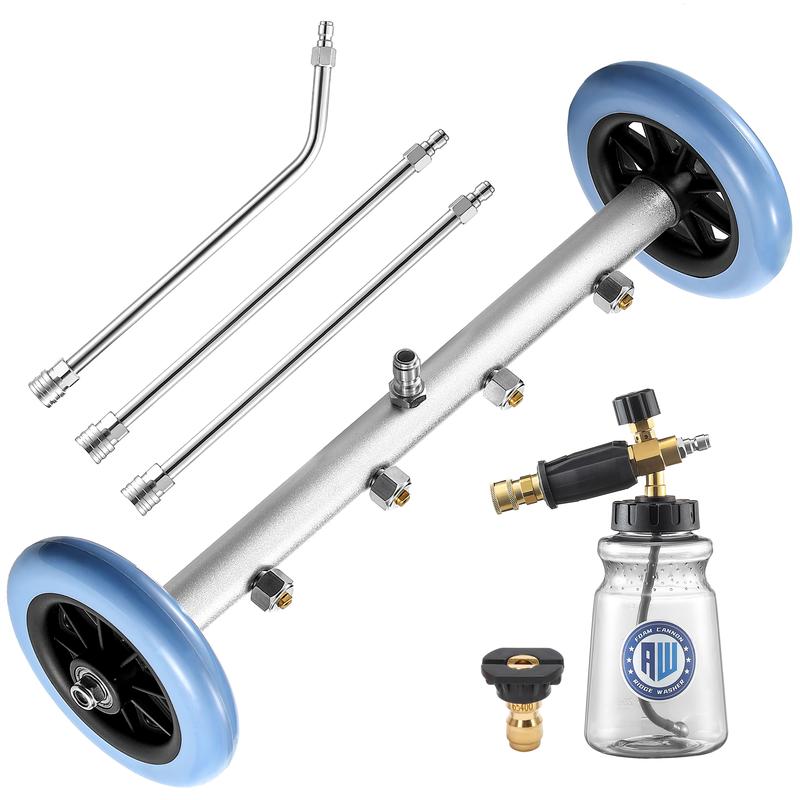 Ā·1 count 16.1 inch undercarriage washer, 2 counts 15.7 inch straight extension wand, 1 count 15.7 inch curved wand, 1 count foam cannon, 1 count black Pressure Washer Spray Nozzle and 4 counts brass undercarriage sprayerās nozzles.