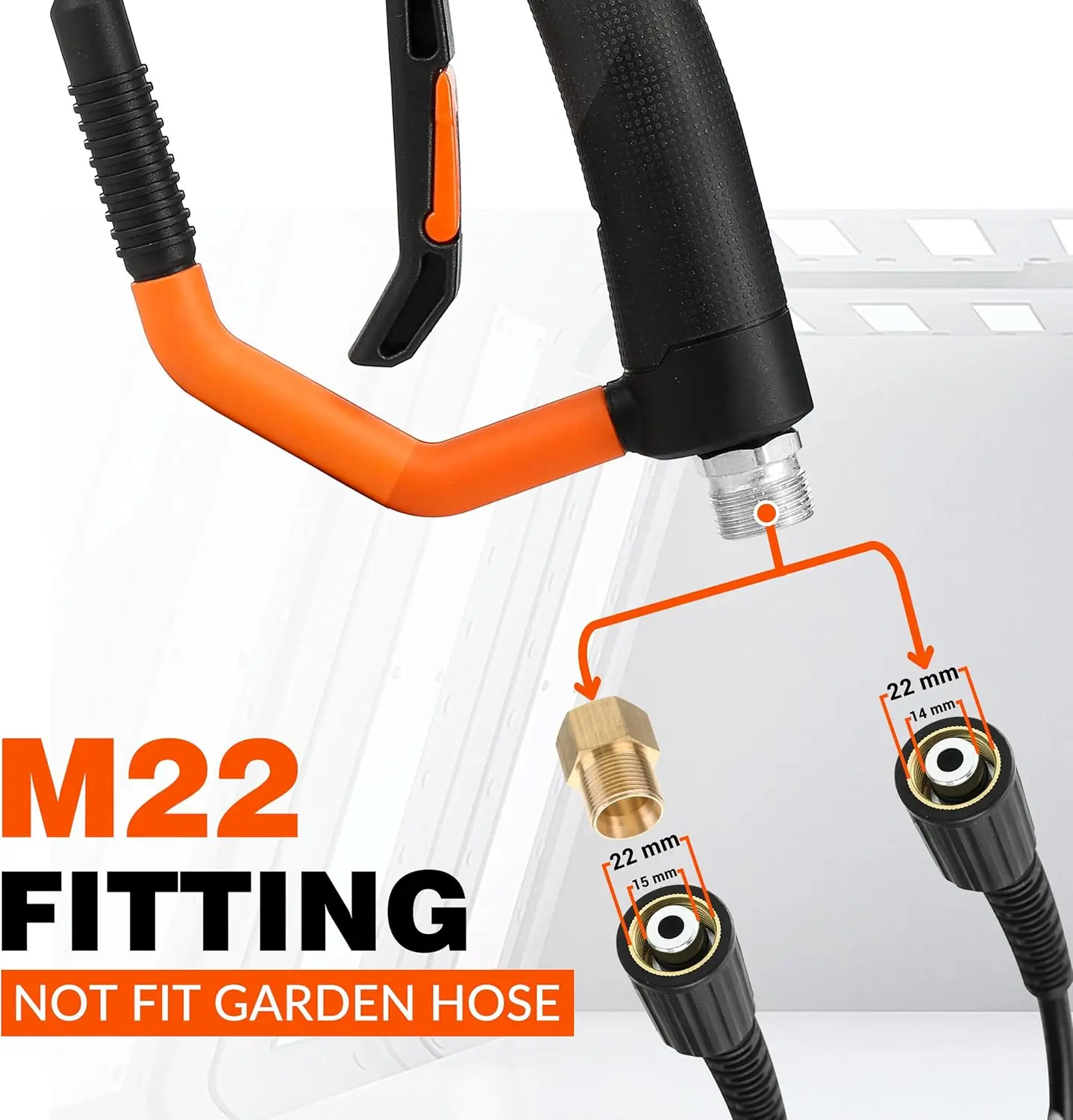 ·HIGH COMPATIBILITY: High pressure washer gun features an M22 fitting, making it compatible with both M22 14mm and M22 15mm fittings. If your hose has an M22 14mm fitting with a 14mm inner diameter, simply connect the power washer gun directly to the pressure washer hose. For a hose with an M22 15mm fitting (15mm inner diameter), attach the brass fitting to the power washer lance and hose. If your hose uses a 3/8'' quick connect, just connect the M22 14mm to 3/8'' plug to the gun and hose
