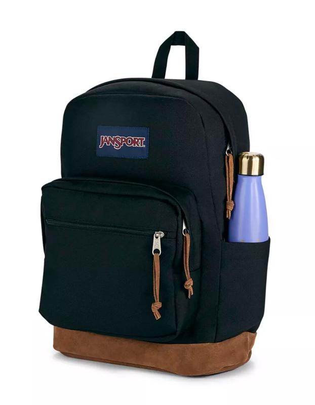 Jan. Sport Right Pack Black Backpack. Shoutout to the Right Pack. After decades of proving its mettle as an all around durable solution, this icon has earned a much deserved upgrade: the side water bottle pocket. Padded laptop sleeve included, itโ€™s finally coming into its own as a feature-packed pack with the confidence youโ€™d expect from such classic style. One large main compartment. Side water bottle pocket. Front utility pocket with organizer. Zippered front stash pocket. 15in laptop sleeve. Straight-cut padded shoulder straps. Printed liner. Premium Corduraยฎ fabric with suede bottom. Dimensions: 18in x 13in x 5.5in. 80% cotton/20% cow hide split suede. Imported.