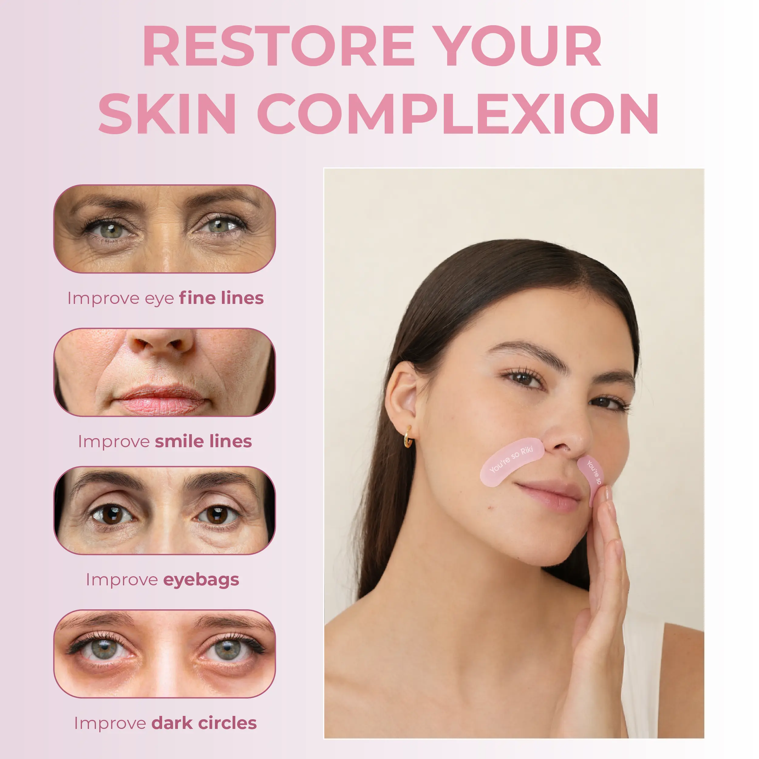 ·Apply under the eyes, on smile lines, or between the brows. Press gently for 30 seconds.