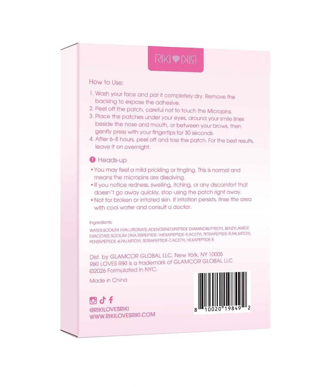 Revive tired skin and smooth fine lines with RIKI’s pioneering Micropin Technology. This bundle includes 3 full sets, and each set contains 3 pairs of precision patches—that’s9 pairs (18 patches) in total for targeted skin renewal. Each precision patch is embedded with 800 self-dissolving micropins made from a potent blend ofhyaluronic acid and peptides, formulated to penetrate the skin’s surface and deliver active ingredients exactly where they’re needed—painlessly and effectively.