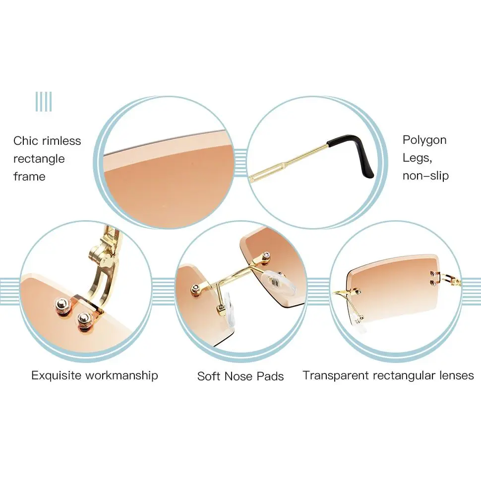 ·Simple and novel: the transparent rectangle sunglasses are featuring with rimless frame and tinted lens, matching with metal glasses legs makes them look delicate and stylish, classic and vivid colors can go well with your different daily clothes and party costumes, making you more elegant and attractive