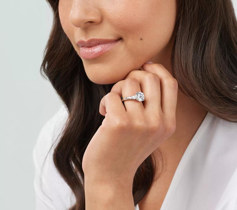·Round, pear, or oval-shaped 100-facet center Diamonique simulated diamond flanked by two tapered baguette Diamonique simulated diamonds; polished finish