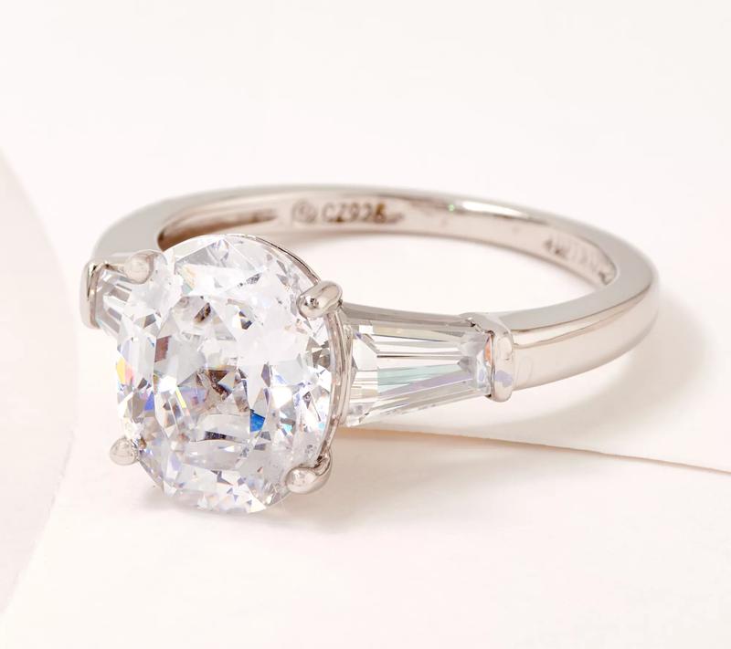 ·Total Diamonique simulated diamond weights are approximate: Round center 4.25 carats; Pear center 5.02 carats; Oval center 8.47 carats; Baguette sides 0.45 carat; Total Round 4.71 carats, Pear 5.47 carats, and Oval 8.92 carats; simulated diamonds are cubic zirconia