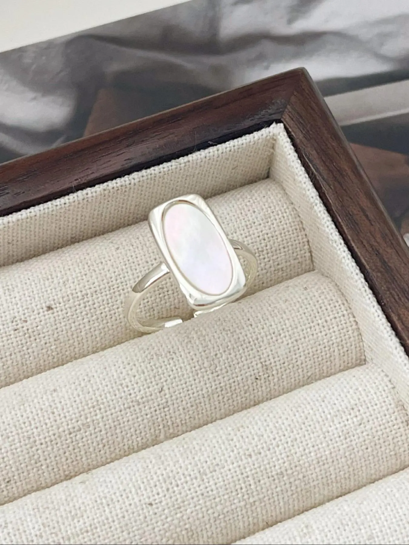5. S925 Sterling Silver Simple Elegant Fashion Geometric Square White Shell Ring, Open Adjustable Finger Ring for Women, Retro Party Dating Gift
