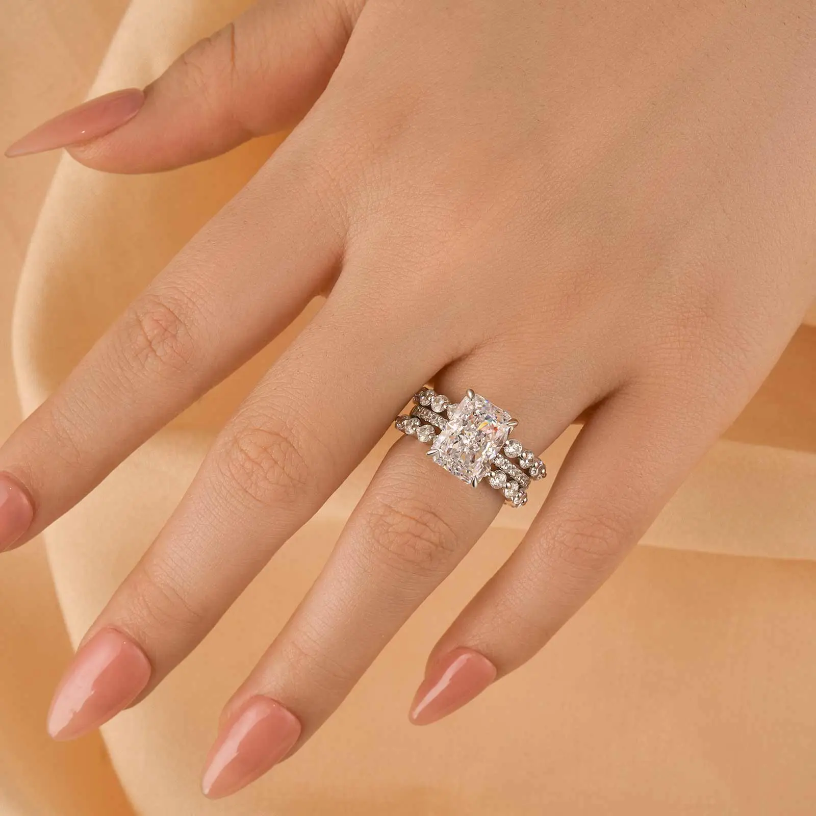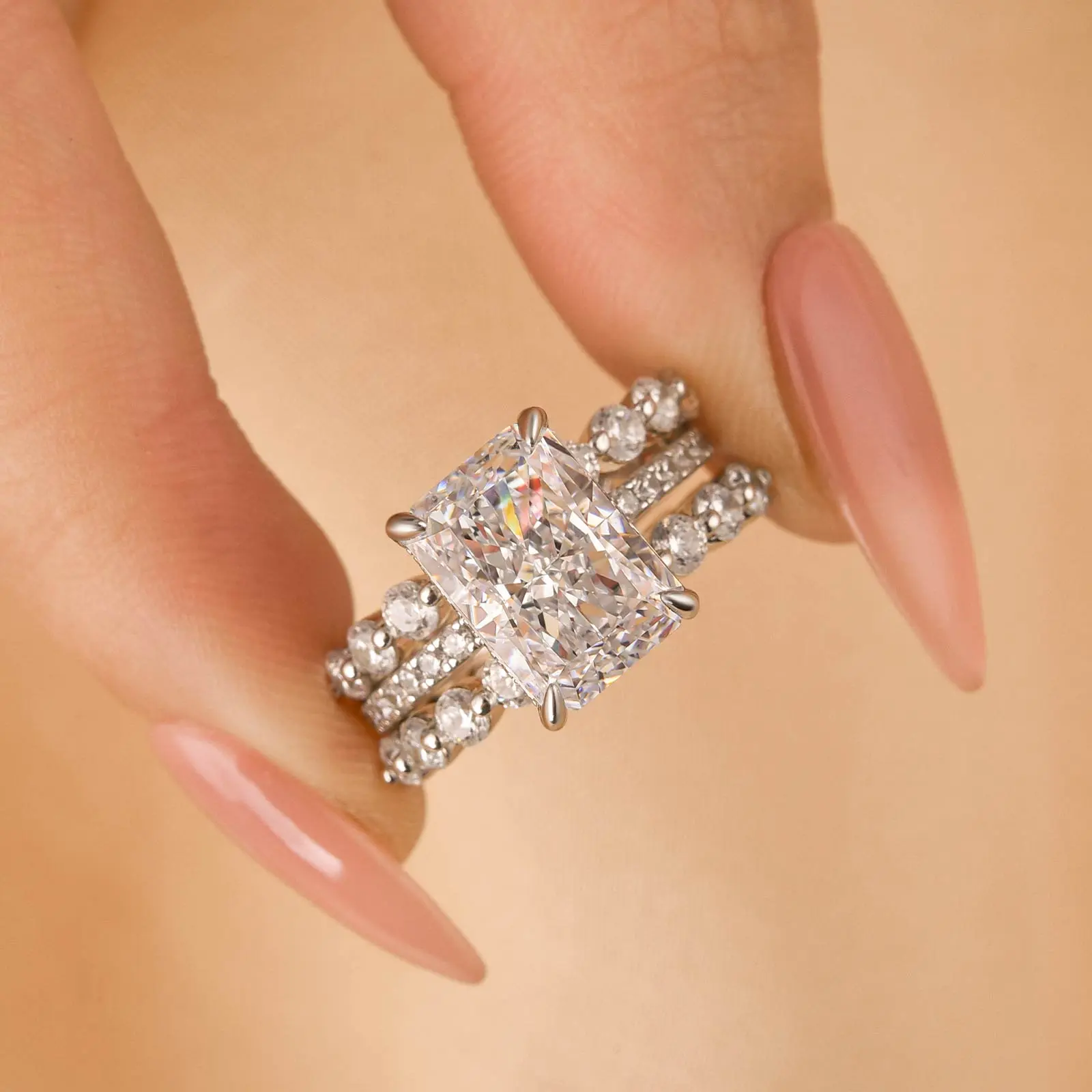 This set is stunning! It sparkles so much and is really an eye catcher. The two bands fit better than the engagement ring which is slightly too big, but I used the enclosed sizer and that makes it fit perfectly. Super happy with this purchase.