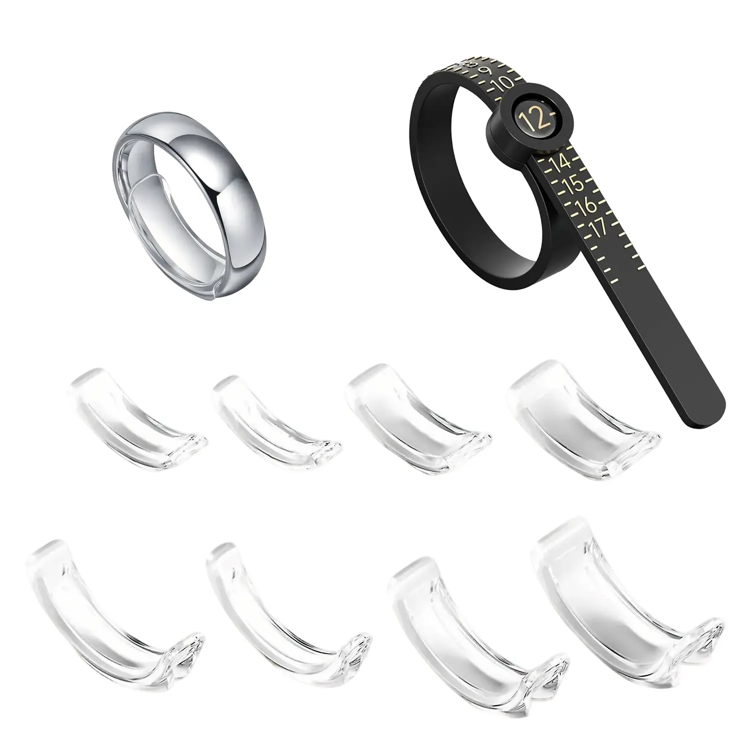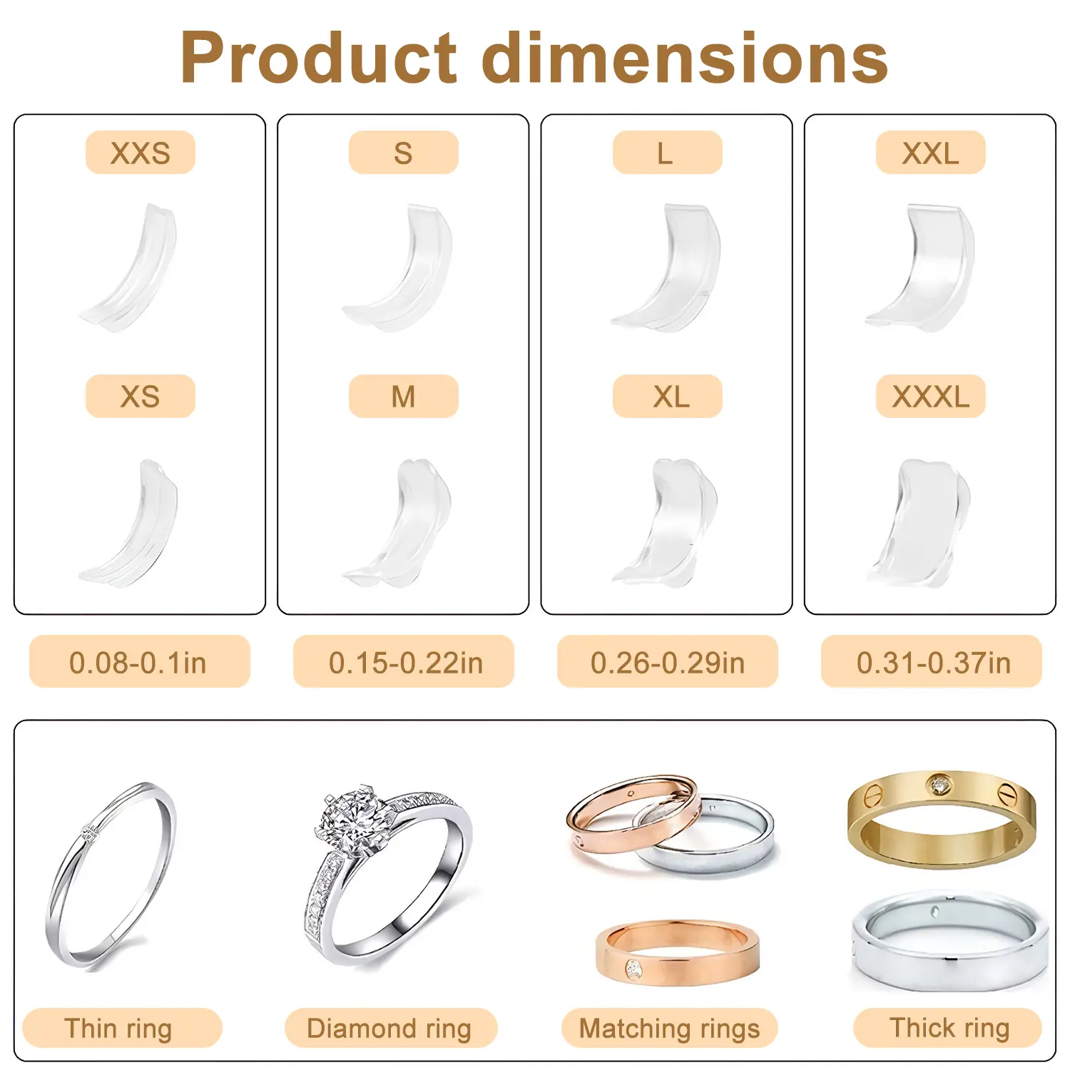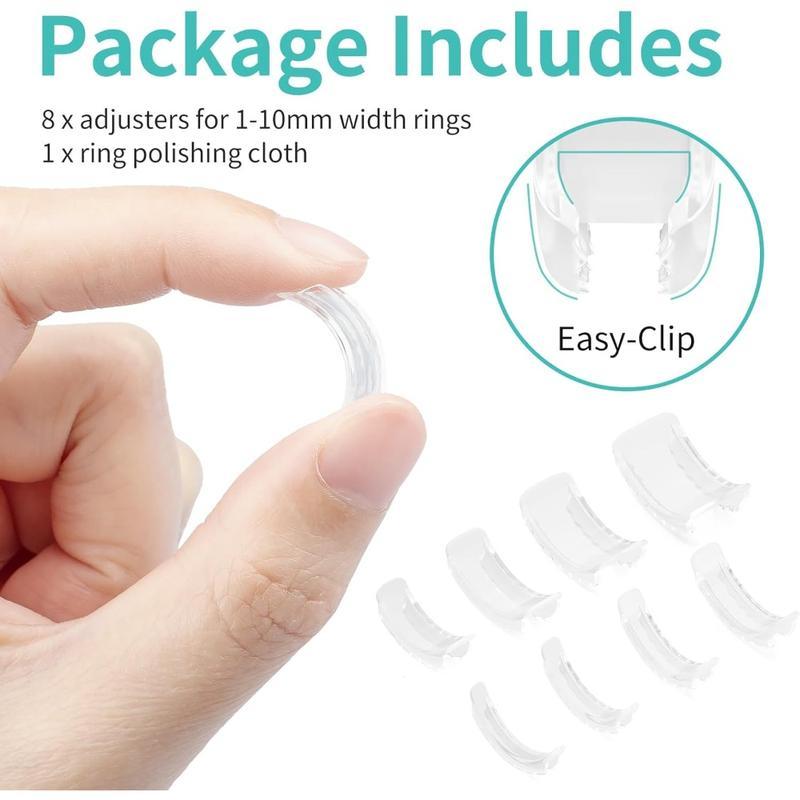 ·Ring Sizer Adjuster Set - Package contains 8 different sizes of ring adjuster, an instruction and a polishing cloth. Ring resizer fits loose rings easily. Ring spacer make rings smaller and prevent them from spinning or falling off.