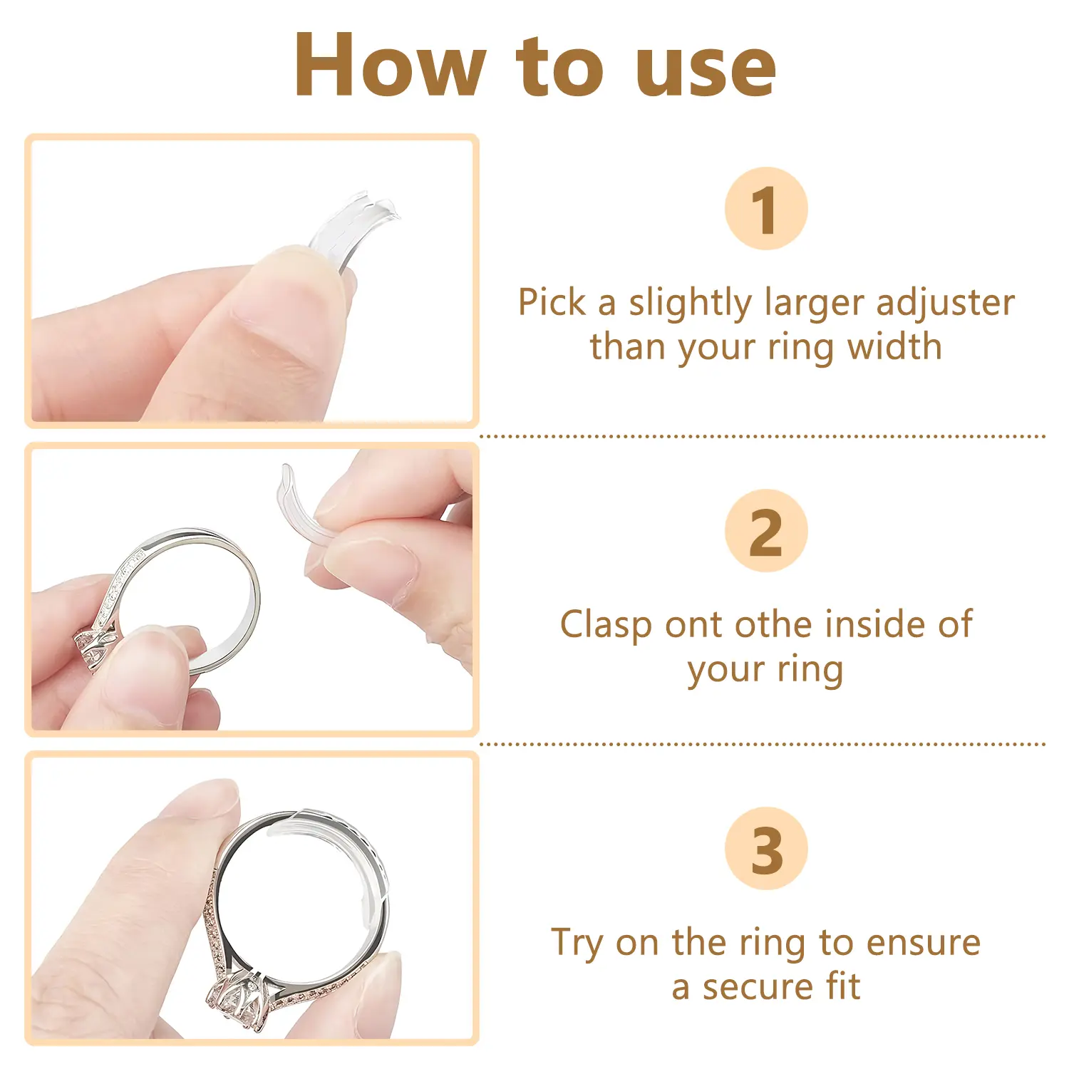 ·Ease of Use - Pick a ring size adjuster that is slightly larger than the width of the ring and snap it to the inside of the ring. Then try on the ring to make sure it fits. Easy to wear and adjust, can be used to fasten loose rings. Easily removes for cleaning and wipes away dirt with ease.