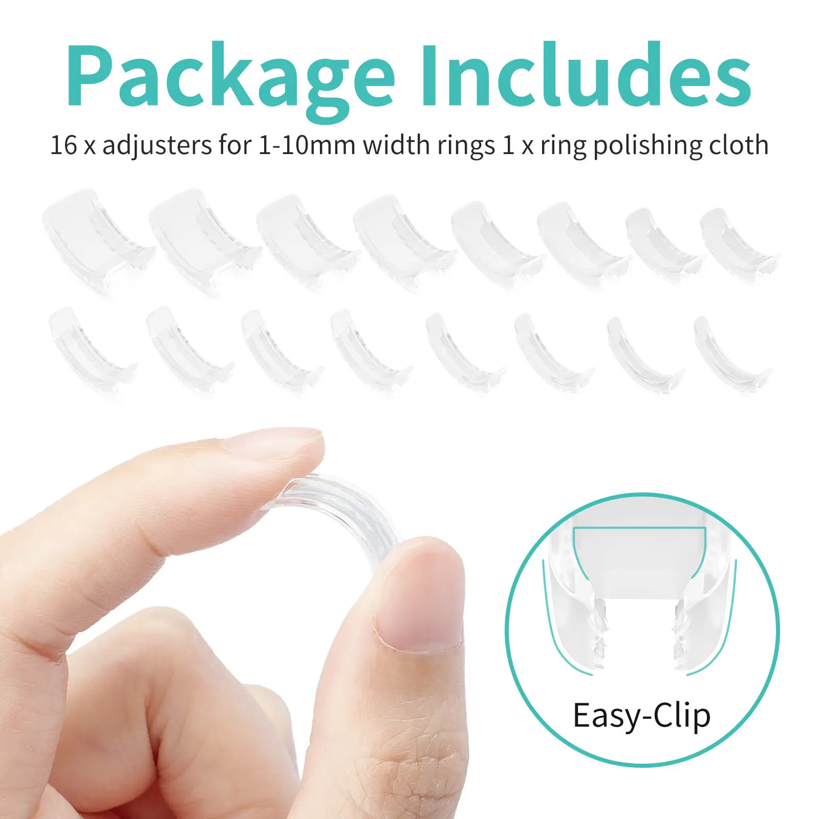 ·Ring Sizer Adjuster Set - Package contains 16 ring adjusters in 8 different sizes, a measuring tool, an instruction and a silver polishing cloth. Ring resizer fits loose rings easily. Ring spacer make rings smaller and prevent them from spinning or falling off.