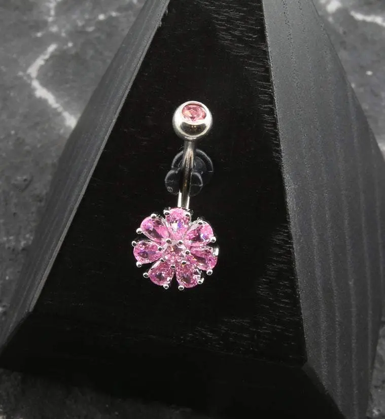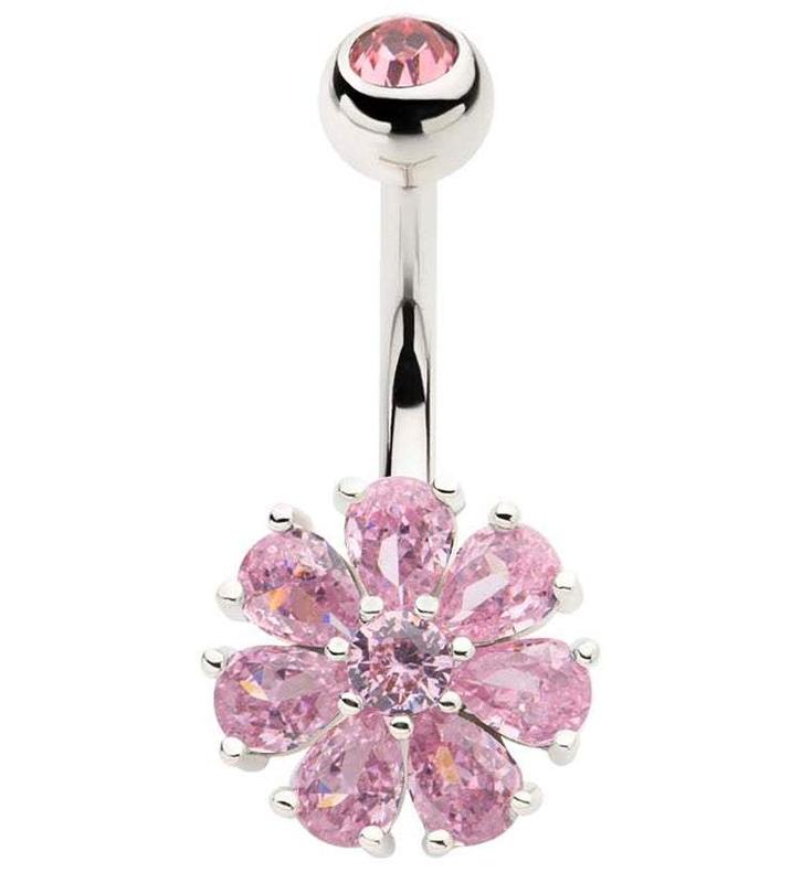 This navel piercing is crafted with a 316L stainless steel 14G barbell with a 5mm pink cz gem top and a beautiful flower shaped bottom made out of round and teardrop pink cz gems. The design measures at about 11mm x 11mm. Size is 14G with a 7/16" (11mm) barbell. Externally threaded, this navel barbell is designed for healed piercings. Sold individually (1pc).
