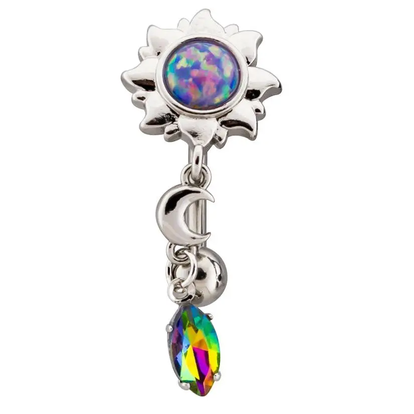 Beautiful belly button ring with a stunning sun design on top with a synthetic purple opal in the center. Accented with a half moon dangling from a  black rainbow aurora cz. Size is 14G with a 3/8" 10mm barbell. It is made from 316L stainless steel. Externally threaded. Top design measures at about 13mm. Dangle is about 21mm. Sold individually (1 pc). For healed piercings.