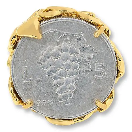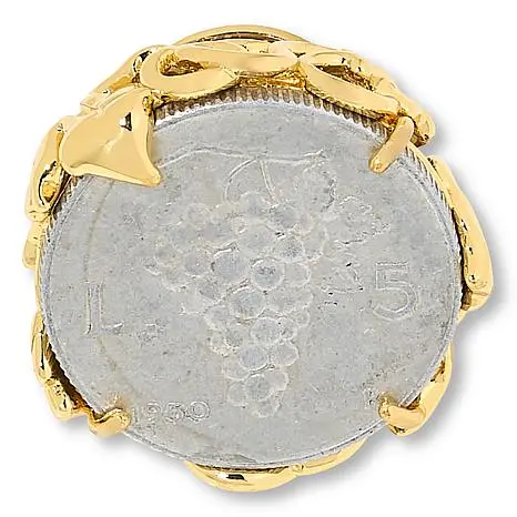 Bellezza Grape Vine 5 Lira Coin Bronze Ring A genuine 5-lira Grape coin forms the top of this richly embellished ring. A conversation-starting statement piece with timeless appeal, the design is a special find for you or a loved one. Approx. 1-3/16"L x 1-3/16"W x 5/16"H; shank 1/4"W 5-lira coin: grape cluster on front; woman's head in profile with held torch on back Scrollwork gallery; split, twist-design shoulders, shank The lira coin may have minor imperfections as it was previously in circulation and has been cleaned