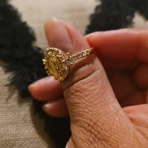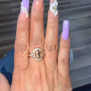 I love my ring. Iâm wearing it on my left hand ring finger as a symbol of my commitment to myself. It is beautiful; the color of the stone is a mossy green. There is sparkle to the setting that I did not expect but I love. Will definitely recommend it to friends if they like it. Wonderful! Shine: Gorgeous.
