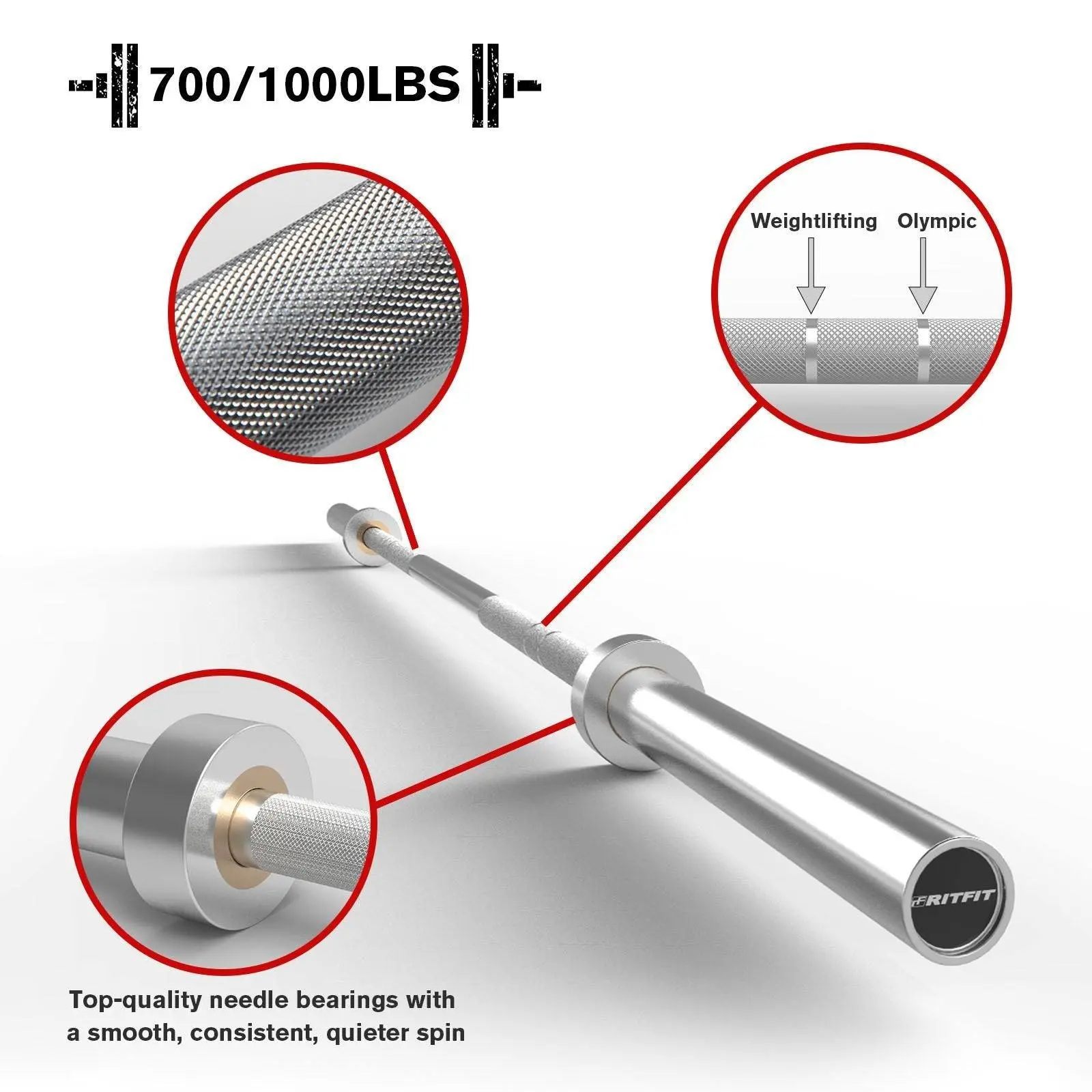 Built to the highest standard, RitFit 7ft Olympic barbell bar uses an excellent tensile strength steel shaft, quality needle bearings, and low-maintenance hard chrome coating sleeves. The 500LB weight bar has a center knurl, which helps hold the bar in place during back squats. While the 700/1000LB weight bar has no center knurl, great for those high reps. The medium-depth knurling offers a firm but non-abrasive grip. Needle bearings allow for a smoother, quieter spin and a more reliable turnover at maximum loads.