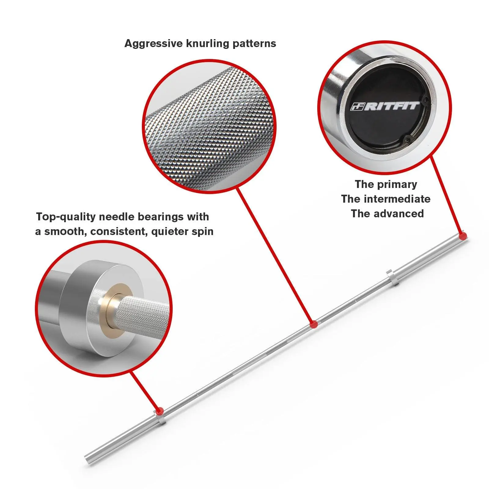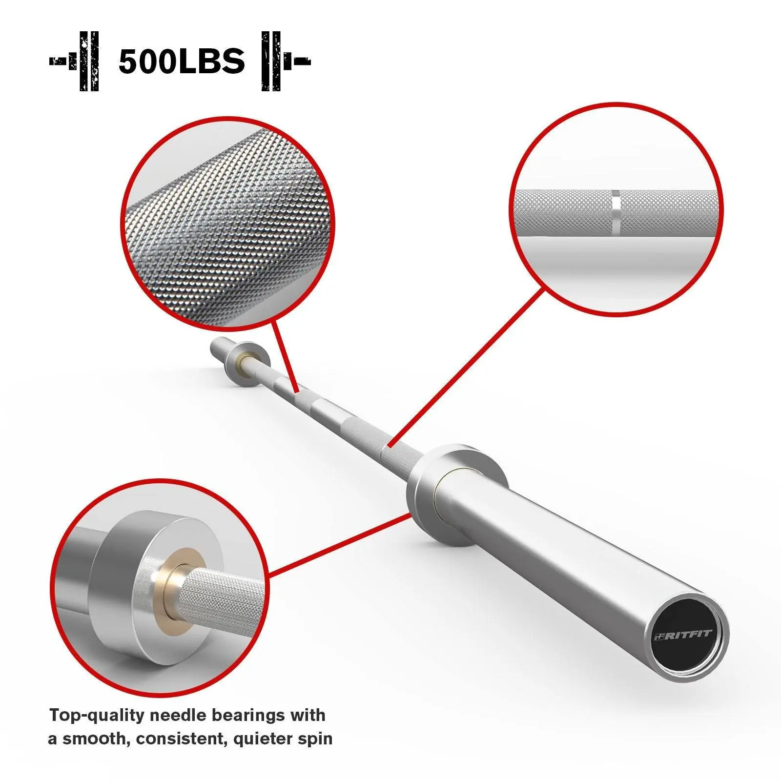 Both bushing and bearing sleeves produce sufficient sleeve rotation, but ball or needle bearings allow for a faster, smoother, quieter spin and have a more reliable turnover for maximum loads, which is a better fit for Olympic-style lifts. By comparison, a bushing sleeve is more efficient for powerlifting movements, which are slower and more strength-focused. RitFit 7ft Olympic Barbell Bar features needle bearing, perfect for Olympic weight lifts.