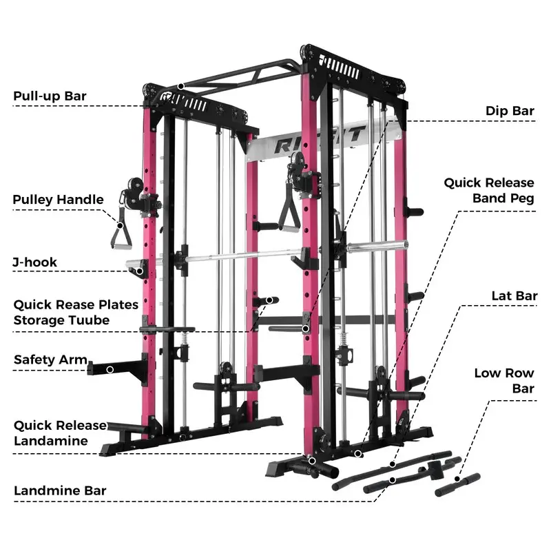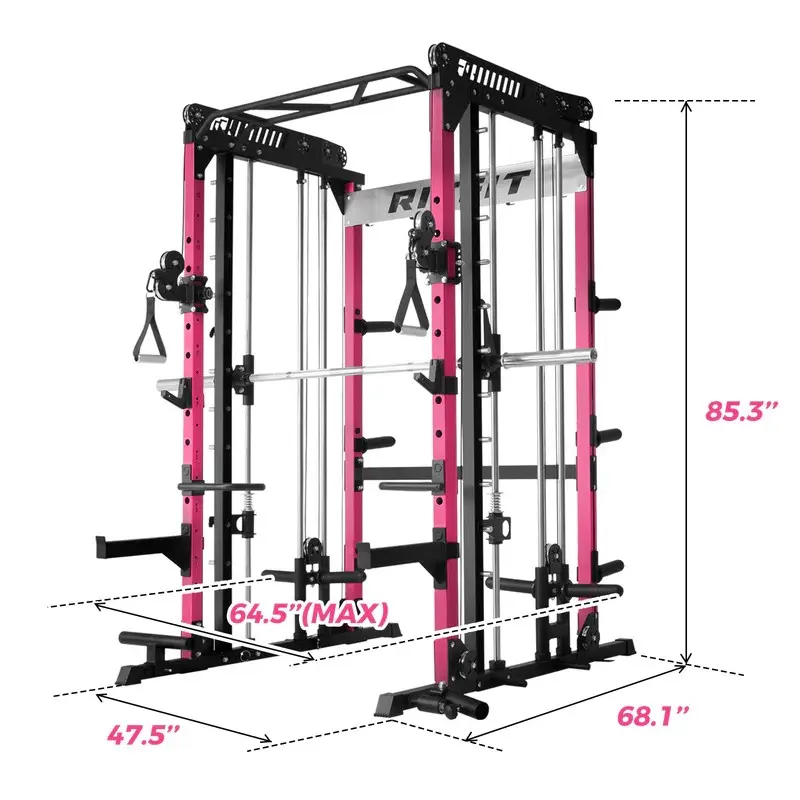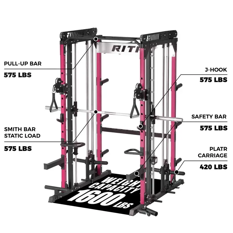 The M1 Smith system features a linear bearing design with professional spring protection, ensuring a smooth and secure lifting experience. With a high weight capacity of up to 1500 lbs and 11 adjustable height settings, perfect for heavy lifting and various strength training exercises.