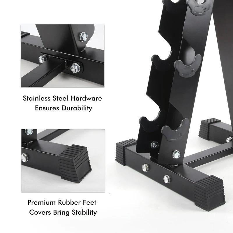The A-Frame dumbbell rack features a space-saving design, ideal for home gyms or studios. Its durable black powder coat finish and rubber floor protectors prevent damage to your flooring. Keep your workout area tidy and protected with this smart design.